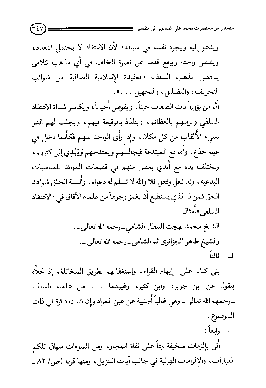 أَمَّا من يؤول آيات الصفات حيناً, ويفوض أَحياناً, ويكاسر شداة الاعتقاد السلفي ويرميهم بالعظائم, ويتلذذ بالوقيعة فيهم, ويجلب لهم النبز بسيء الأَلقاب من كل مكان, وإِذا رأَى الواحد منهم فكأَنما دخل في عينه جذع, وأَما مع المبتدعة فيجالسهم ويمتدحهم وَيَهْدِي إِلى كتبهم, وتختلف يده مع أَيدي بعض منهم في قصعات الموائد للمناسبات البدعية, وقد فعل وفعل فلا والله لا تسلم له دعواه. وأَلسنة الخلق شواهد الحق فمن ذا الذي يستطيع أَن يغمز وجوهاً من علماء الآفاق في ((الاعتقاد السلفي)) أَمثال: الشيخ محمد بهجت البيطار الشامي – رحمه الله تعالى - والشيخ طاهر الجزائري ثم الشامي – رحمه الله تعالى -.
