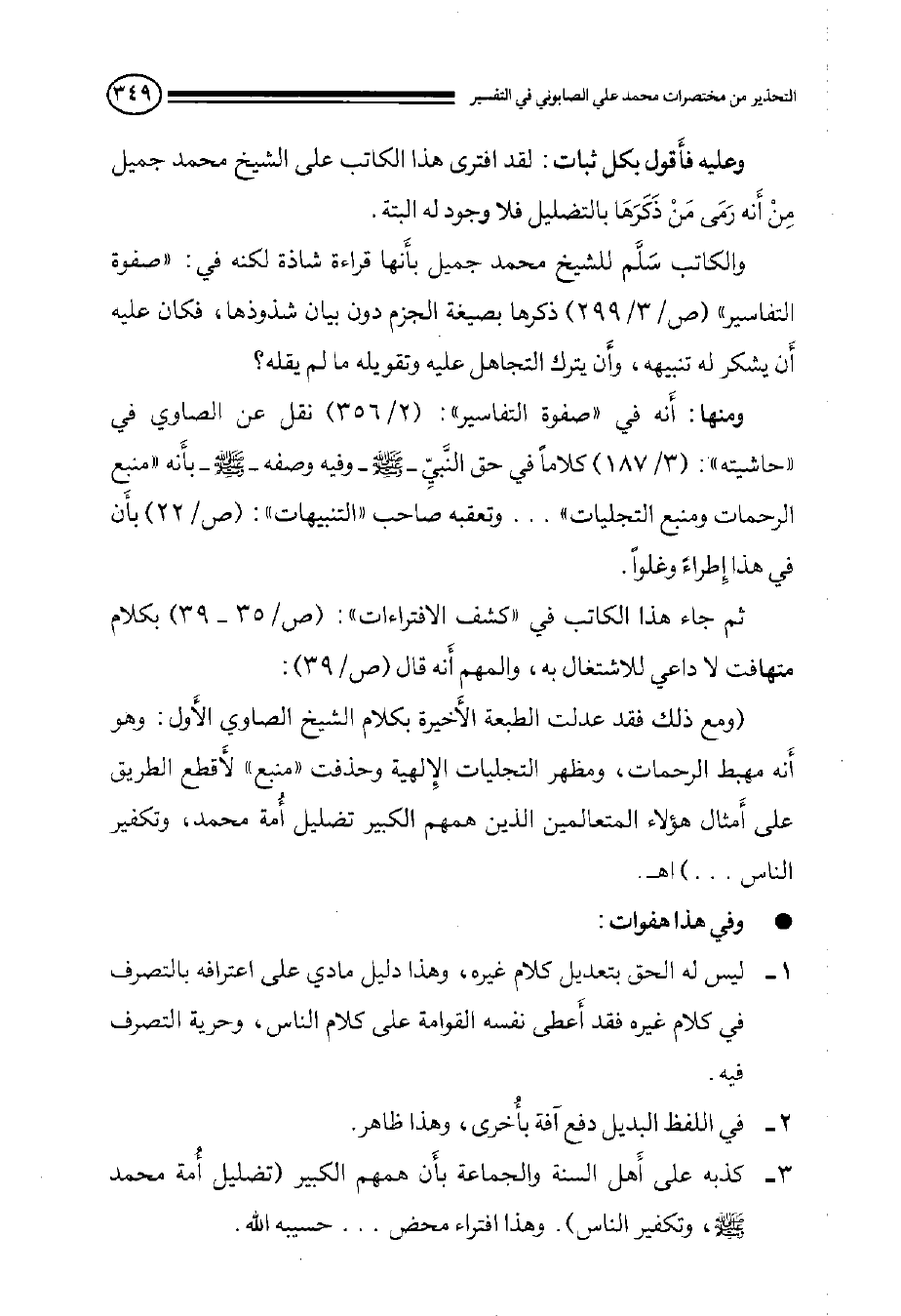 ومنها: أَنه في ((صفوة التفاسير)) : (2/ 356) نقل عن الصاوي في ((حاشيته)) : (3/ 187) كلاماً في حق النَّبيِّ - صلى الله عليه وسلم - وفيه وصفه - صلى الله عليه وسلم - بأَنه ((منبع الرحمات ومنبع التجليات)) . . . وتعقبه صاحب ((التنبيهات)) : (ص / 22) بأَن في هذا إِطراءً وغلواً.