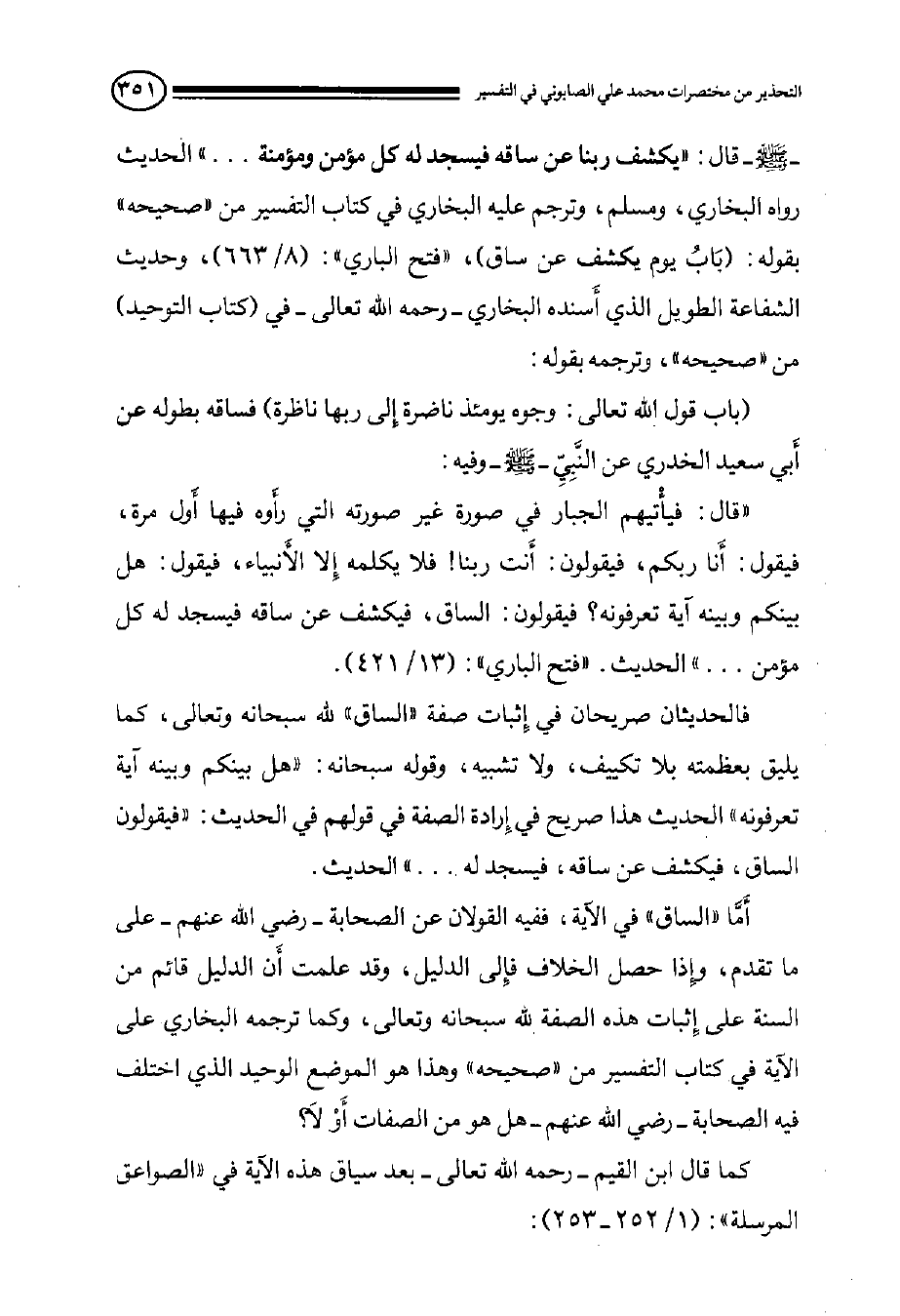 - صلى الله عليه وسلم - قال: ((يكشف ربنا عن ساقه فيسجد له كل مؤمن ومؤمنة. . .)) الحديث رواه البخاري, ومسلم, وترجم عليه البخاري في كتاب التفسير من ((صحيحه)) بقوله: (بَابُ يوم يكشف عن ساق) , ((فتح الباري)) : (8/ 662) , وحديث الشفاعة الطويل الذي أَسنده البخاري – رحمه الله تعالى - في (كتاب التوحيد) من ((صحيحه)) , وترجمه بقوله: (باب قول الله تعالى: وجوه يومئذ ناضرة إِلى ربها ناظرة) فساقه بطوله عن أَبي سعيد الخدري عن النَّبِيِّ - صلى الله عليه وسلم - وفيه: ((قال: فيأْتيهم الجبار في صورة غير صورته التي رأَوه فيها أَول مرة, فيقول: أَنا ربكم, فيقولون: أَنت ربنا؟ فلا يكلمه إِلا الأَنبياء, فيقول: هل بينكم وبينه آية تعرفونه؟ فيقولون: الساق, فيكشف عن ساقه فيسجد له كل مؤمن. . .)) الحديث. ((فتح الباري)) : (13/ 421) . فالحديثان صريحان في إِثبات صفة ((الساق)) لله سبحانه وتعالى, كما يليق بعظمته بلا تكييف, ولا تشبيه, وقوله سبحانه: ((هل بينكم وبينه آية تعرفونه)) الحديث هذا صريح في إِرادة الصفة في قولهم في الحديث: ((فيقولون الساق, فيكشف عن ساقه, فيسجد له. . .) الحديث. أَمَّا ((الساق)) في الآية, ففيه القولان عن الصحابة – رضي الله عنهم - على ما تقدم, وإِذا حصل الخلاف فإِلى الدليل, وقد علمت أَن الدليل قائم من السنة على إِثبات هذه الصفة لله سبحانه وتعالى, وكما ترجمه البخاري على الآية في كتاب التفسير من ((صحيحه)) وهذا هو الموضع الوحيد الذي اختلف فيه الصحابة – رضي الله عنهم - هل هو من الصفات أَوْ لاَ؟