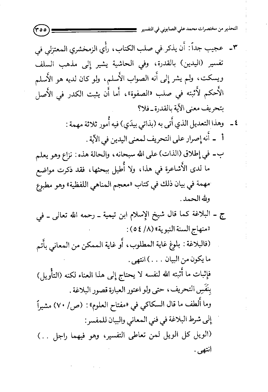 3- عجيب جداً: أَن يذكر في صلب الكتاب, رأُي الزمخشري المعتزلي في تفسير ((اليدين)) بالقدرة, وفي الحاشية يشير إِلى مذهب السلف ويسكت, ولم يشر إِلى أَنه الصواب الأَسلم, ولو كان لديه هو الأَسلم الأَحكم لأَثبته في صلب ((الصفوة)) , أَما أَن يثبت الكدر في الأَصل بتحريف معنى الآية بالقدرة – فلا؟