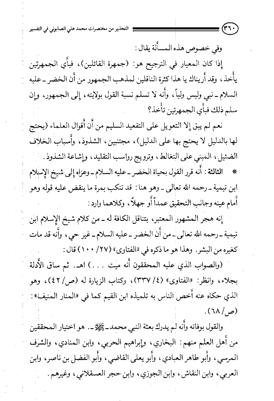 إِنه هجر المشهور المعتبر, بتناقل الكافة له, من كلام شيخ الإِسلام ابن تيمية -رحمه الله تعالى- من أَن الخضر - عليه السلام - غير حي, وأَنه قد مات كغيره من البشر. وهذا هو ما ذكره في ((الفتاوى)) (27/ 100) قال: (والصواب الذي عليه المحققون أَنه ميت. . .) اهـ. ثم ساق الأَدلة بجلاء, وانظر: ((الفتاوى)) (4/ 337) , وكتاب الزيارة له (ص / 42) , وهو الذي حكاه عنه أَخص الناس به تلميذه ابن القيم كما في ((المنار المنيف)) (ص / 68) . والقول بوفاته وأَنه لم يدرك بعثة النبي - صلى الله عليه وسلم -. هو اختيار المحققين من أَهل العلم منهم: البخاري, وإِبراهيم الحربي, وابن المنادي, والشرف المرسي, وأَبو طاهر العبادي, وأَبو يعلى القاضي, وأَبو الفضل بن ناصر, وابن العربي, وابن النقاش, وابن الجوزي, وابن حجر العسقلاني, وغيرهم.