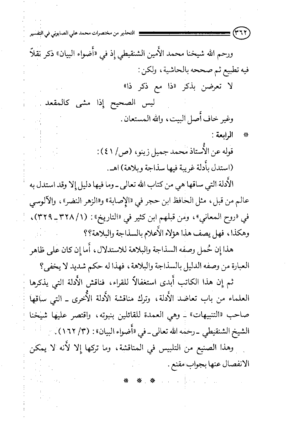 الأَدلة التي ساقها هي من كتاب الله تعالى - وما فيها دليل إِلا وقد استدل به عالم من قبل, مثل الحافظ ابن حجر في ((الإِصابة)) و ((الزهر النضر)) , والآلوسي في ((روح المعاني)) , ومن قبلهم ابن كثير في ((التاريخ)) : (1/ 328, 329) , وهكذا, فهل يصف هذا هؤلاء الأَعلام بالسذاجة والبلاهة؟؟ هذا إِن حُمل وصفه السذاجة والبلاهة للاستدلال, أَما إِن كان على ظاهر العبارة من وصفه الدليل بالسذاجة والبلاهة, فهذا له حكم شديد لا يخفى؟ ثم إِن هذا الكاتب أَبدى استغفالاً للقراء, فناقش الأَدلة التي يذكرها العلماء من باب تعاضد الأَدلة, وترك مناقشة الأَدلة الأُخرى - التي ساقها صاحب ((التنبيهات)) - وهي العمدة للقائلين بنبوته, واقتصر عليها شيخنا الشنقيطي - رحمه الله تعالى - في ((أَضواء البيان)) : (3/ 162) .