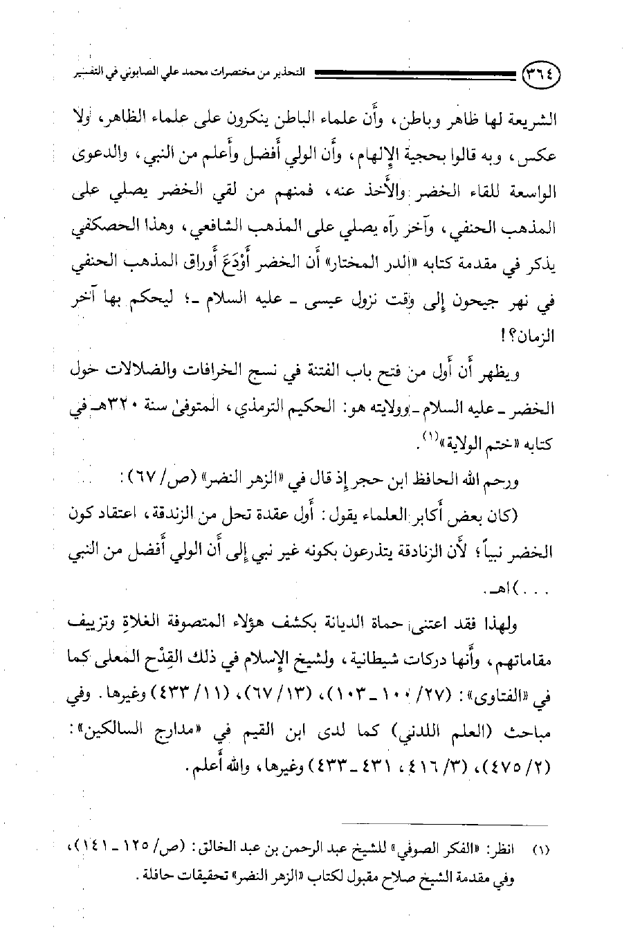 ويظهر أَن أَول من فتح باب الفتنة في نسج الخرافات والضلالات حول الخضر -عليه السلام- وولايته هو: الحكيم الترمذي, المتوفى سنة 320هـ في كتابه ((ختم الولاية)) (¬1) . ورحم الله الحافظ ابن حجر إِذ قال في ((الزهر النضر)) (ص / 67) : (كان بعض أَكابر العلماء يقول: أَول عقدة تحل من الزندقة, اعتقاد كون الخضر نبياً, لأَن الزنادقة يتذرعون بكونه غير نبي إِلى أَن الولي أَفضل من النبي. .) اهـ. ولهذا فقد اعتنى حماة الديانة بكشف هؤلاء المتصوفة الغلاةِ وتزييف مقاماتهم, وأَنها دركات شيطانية, ولشيخ الإِسلام في ذلك القِدْح المعلى كما في ((الفتاوى)) : (27/ 100, 103) , (13/ 67) , (11/ 433) وغيرها. وفي مباحث (العلم اللدني) كما لدى ابن القيم في ((مدارج السالكين)) : (2/ 475) , (3/ 416, 431-433) وغيرها, والله أَعلم.