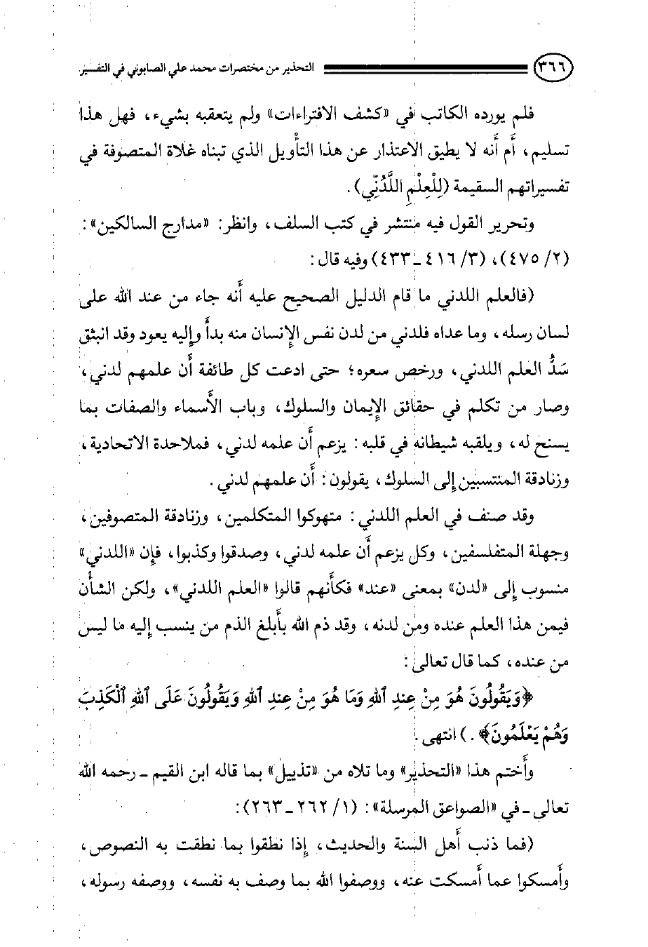 وتحرير القول فيه منتشر في كتب السلف, انظر: ((مدارج السالكين)) : (2/ 475) , (3/ 416, 433) وفيه قال: (فالعلم اللدني ما قام الدليل الصحيح عليه أَنه جاء من عند الله على لسان رسله, وما عداه فلدني من لدن نفس الإِنسان منه بدأَ وإِليه يعود وقد انبثق سَدُّ العلم اللدني, ورخص سعره, حتى ادعت كل طائفة أَن علمهم لدني, وصار من تكلم في حقائق الإِيمان والسلوك, وباب الأَسماء والصفات بما يسنح له, ويلقبه شيطانه في قلبه: يزعم أَن علمه لدني, فملاحدة الاتحادية, وزنادقة المنتسبين إِلى السلوك, يقولون: أَن علمهم لدني. وقد صنف في العلم اللدني: متهوكوا المتكلمين, وزنادقة المتصوفين, وجهلة المتفلسفين, وكل يزعم أَن علمه لدني, وصدقوا وكذبوا, فإِن ((اللدني)) منسوب إِلى ((لدن)) بمعنى ((عند)) فكأَنهم قالوا ((العلم اللدني)) , ولكن الشأْن فيمن هذا العلم عنده ومن لدنه, وقد ذم الله بأََبلغ الذم من ينسب إِليه ما ليس من عنده, كما قال تعالى: {وَيَقُولُونَ هُوَ مِنْ عِنْدِ اللَّهِ وَمَا هُوَ مِنْ عِنْدِ اللَّهِ وَيَقُولُونَ عَلَى اللَّهِ الْكَذِبَ وَهُمْ يَعْلَمُونَ} انتهى. وأَختم هذا ((التحذير)) وما تلاه من ((تذييل)) بما قاله ابن القيم - رحمه الله تعالى - في ((الصواعق المرسلة)) : (1/ 262, 263) : (فما ذنب أَهل السنة والحديث, إِذا نطقوا بما نطقت به النصوص, وأَمسكوا عما أَمسكت عنه, ووصفوا الله بما وصف به نفسه, ووصفه رسوله,