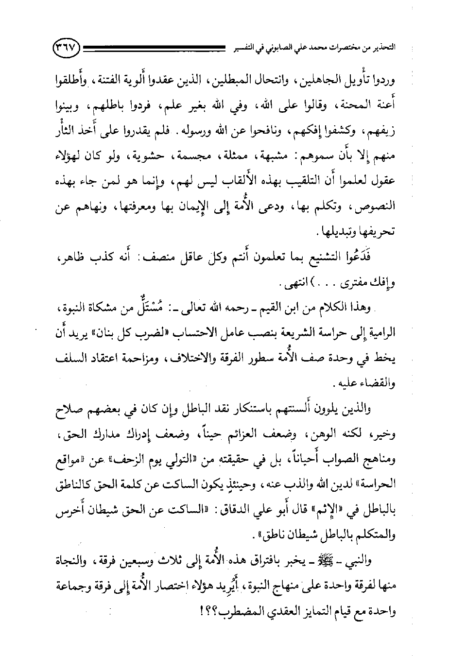 وهذا الكلام من ابن القيم - رحمه الله تعالى -: مُسْتَلٌّ من مشكاة النبوة, الرامية إِلى حراسة الشريعة بنصب عامل الاحتساب ((لضرب كل بنان)) يريد أَن يخط في وحده صف الأُمة سطور الفرقة والاختلاف, ومزاحمة اعتقاد السلف والقضاء عليه. والذين يلوون أَلسنتهم باستنكار نقد الباطل وإِن كان في بعضهم صلاح وخير, لكنه الوهن, وضعف العزائم حيناً, وضعف إِدراك مدارك الحق, ومناهج الصواب أَحياناً, بل في حقيقته من ((التولي يوم الزحف)) عن ((مواقع الحراسة)) لدين الله والذب عنه, وحينئذٍ يكون الساكت عن كلمة الحق كالناطق بالباطل في ((الإِثم)) قال أَبو على الدقاق: ((الساكت عن الحق شيطان أَخرس والمتكلم بالباطل شيطان ناطق)) . والنبي - صلى الله عليه وسلم - يخبر بافتراق هذه الأُمة إِلى ثلاث وسبعين فرقة, والنجاة منها لواحدة على منهاج النبوة, أَيُرِيد هؤلاء اختصار الأُمة إِلى فرقة وجماعة واحدة مع قيام التمايز العقدي المضطرب؟؟!
