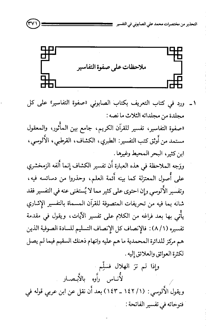 1- ورد في كتاب التعريف بكتاب الصابوني ((صفوة التفاسير)) على كل مجلدة من مجلداته الثلاث ما نصه: (صفوة التفاسير, تفسير للقرآن الكريم, جامع بين المأْثور, والمعقول مستمد من أَوثق كتب التفسير: الطبري, الكشاف, القرطبي, الأَلوسي, ابن كثير, البحر المحيط وغيرها. ووَجه الملاحظة في هذه العبارة أَن تفسير الكشاف إِنما أَلفه الزمخشري على أُصول المعتزلة كما بينه أَئمة العلم, وحذروا من دسائسه فيه, وتفسير الأَلوسي وإِن احتوى على كثير مما لا يُستغنى عنه في التفسير فقد شانه بما فيه من تحريفات المتصوفة للقرآن المسماة بالتفسير الإِرشادي يأْتي بها بعد فراغه من الكلام على تفسير الآيات, ويقول في مقدمة تفسيره (1/ 8) : فالإِنصاف كل الإِنصاف التسليم للسادة الصوفية الذين هم مركز للدائرة المحمدية ما هم عليه واتهام ذهنك السقيم فيما لم يصل لكثرة العوائق والعلائق إِليه: