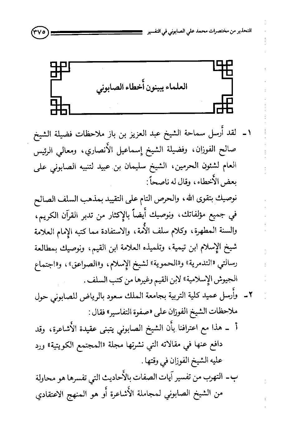 أ- هذا مع اعترافنا بأَن الصابوني يتبنى عقيدة الأَشاعرة, وقد دافع عنها في مقالاته التي نشرتها مجلة ((المجتمع الكويتية)) ورد عليه الشيخ الفوزان في وقتها.