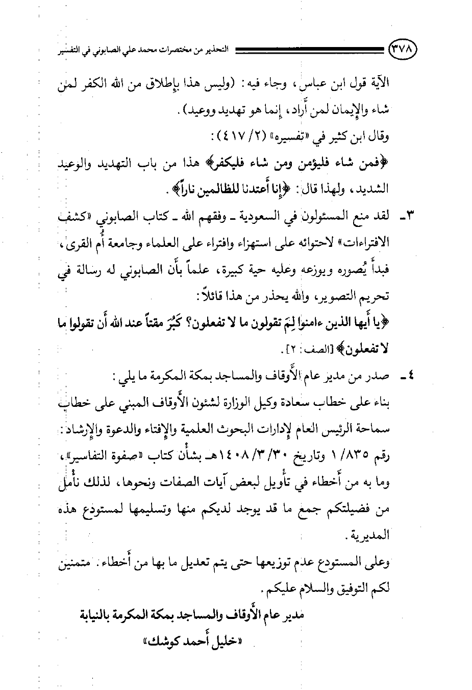 4- صدر من مدير عام الأَوقاف والمساجد بمكة المكرمة ما يلي: بناء على خطاب سعادة وكيل الوزارة لشئون الأَوقاف المبني على خطاب سماحة الرئيس العام لإِدارات البحوث العلمية والإِفتاء والدعوة والإِرشاد: رقم 835/ 1 وتاريخ 30/ 3 / 1408هـ بشأْن كتاب ((صفوة التفاسير)) , وما به من أَخطاء في تأْويل لبعض آيات الصفات ونحوها, لذلك نأْمل من فضيلتكم جمع ما قد يوجد لديكم منها وتسليمها لمستودع هذه المديرية. وعلى المستودع عدم توزيعها حتى يتم تعديل ما بها من أَخطاء. متمنيين لكم التوفيق والسلام عليكم.