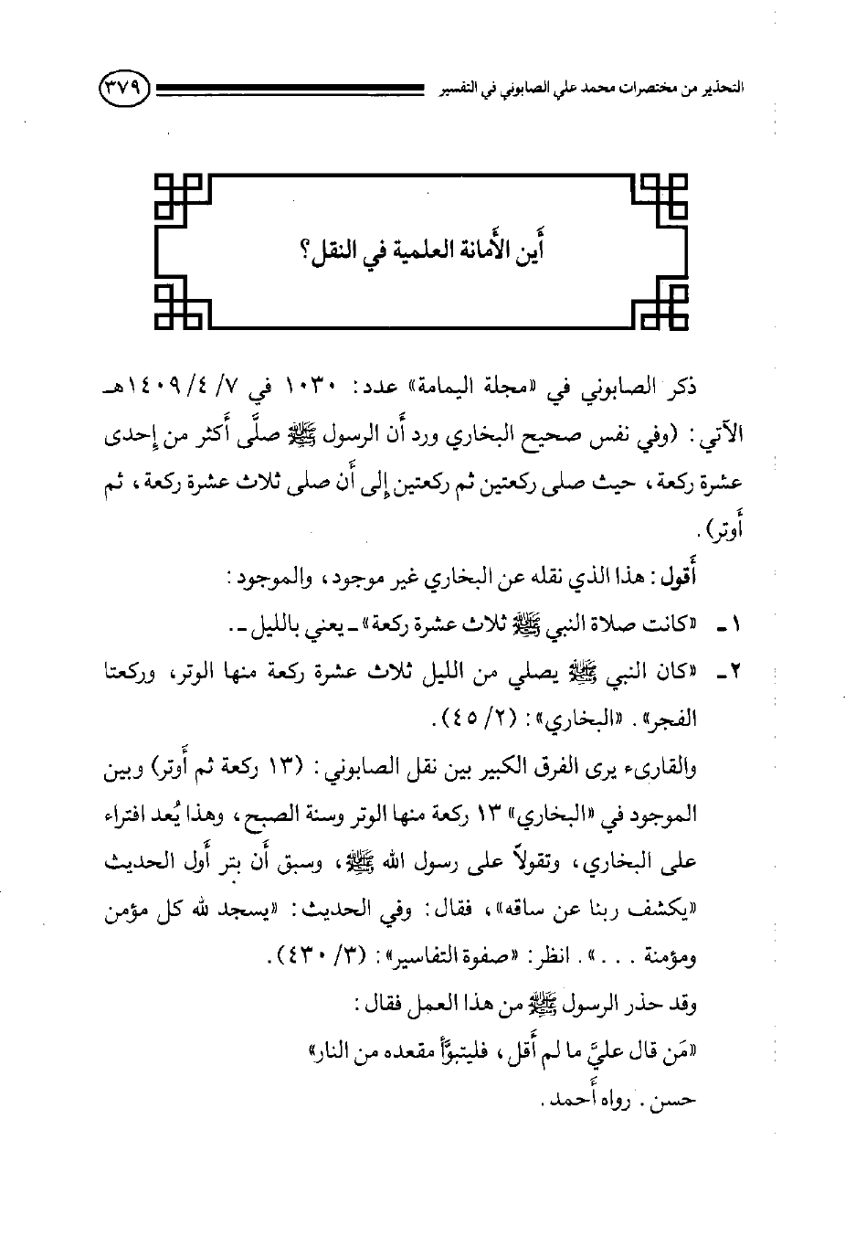 2- ((كان النبي - صلى الله عليه وسلم - يصلي من الليل ثلاث عشرة ركعة منها الوتر, وركعتا الفجر)) . ((البخاري)) : (2/ 45) . والقارئ يرى الفرق الكبير بين نقل الصابوني: (13 ركعة ثم أَوتر) وبين الموجود في ((البخاري)) 13 ركعة منها الوتر وسنة الصبح, وهذا يُعد افتراء على البخاري, وتقولاً على رسول الله - صلى الله عليه وسلم - , وسبق أَن بتر أَول الحديث ((يكشف ربنا عن ساقه)) , فقال: وفي الحديث: ((يسجد لله كل مؤمن ومؤمنه. . .)) . انظر: ((صفوة التفاسير)) : (3/ 430) . وقد حذر الرسول - صلى الله عليه وسلم - من هذا العمل فقال: ((مَن قال عليَّ ما لم أَقل, فليتبوَّأ مقعده من النار)) . حسن. رواه أَحمد.