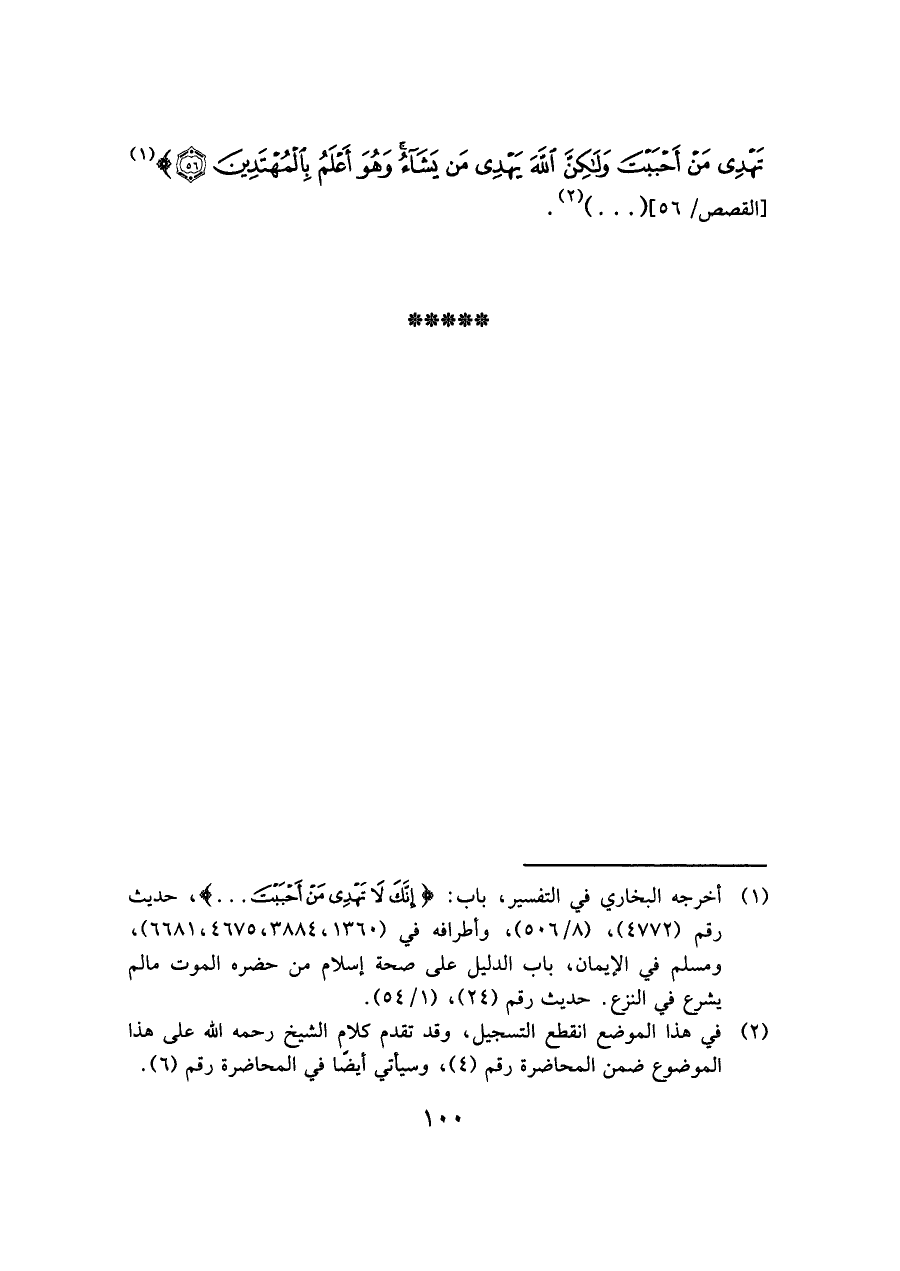 تَهْدِي مَنْ أَحْبَبْتَ وَلَكِنَّ اللَّهَ يَهْدِي مَنْ يَشَاءُ وَهُوَ أَعْلَمُ بِالْمُهْتَدِينَ (٥٦)} (١) [القصص: ٥٦] ( ... ) (٢).