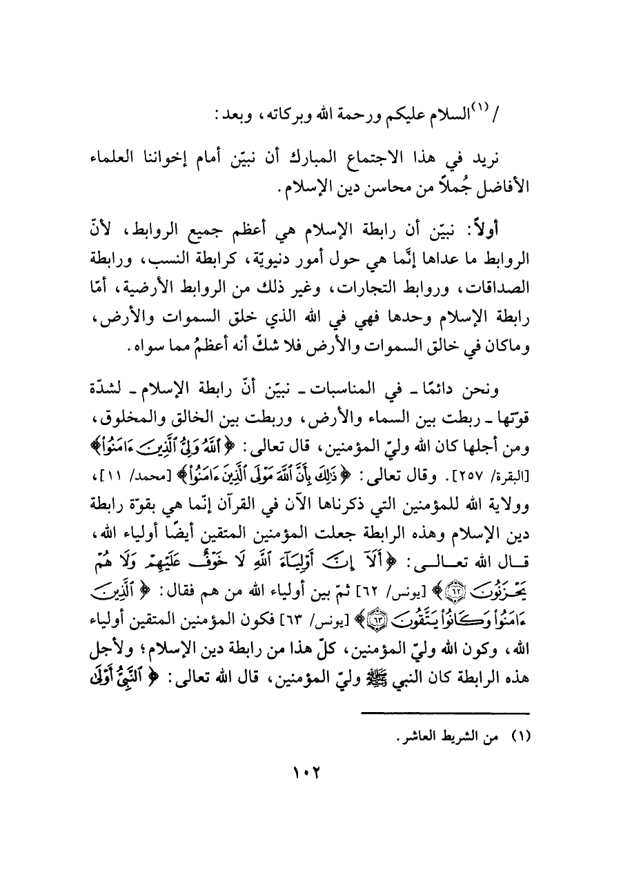 ونحن دائمًا -في المناسبات- نبيّن أنّ رابطة الإسلام -لشدّة قوتها- ربطت بين السماء والأرض، وربطت بين الخالق والمخلوق، ومن أجلها كان الله ولي المؤمنين، قال تعالى: {اللَّهُ وَلِيُّ الَّذِينَ آمَنُوا} [البقرة: ٢٥٧]. وقال تعالى: {اللَّهَ مَوْلَى الَّذِينَ آمَنُوا} [محمد: ١١]، وولاية الله للمؤمنين التي ذكرناها الآن في القرآن إنّما هي بقوّة رابطة دين الإسلام وهذه الرابطة جعلت المؤمنين المتقين أيضًا أولياء الله، قال الله تعالى: {أَلَا إِنَّ أَوْلِيَاءَ اللَّهِ لَا خَوْفٌ عَلَيهِمْ وَلَا هُمْ يَحْزَنُونَ (٦٢)} [يونس: ٦٢] ثمّ بين أولياء الله من هم فقال: {الَّذِينَ آمَنُوا وَكَانُوا يَتَّقُونَ} فكون المؤمنين المتقين أولياء الله، وكون الله وليّ المؤمنين، كلّ هذا من رابطة دين الإسلام؛ ولأجل هذه الرابطة كان النبي - صلى الله عليه وسلم - وليّ المؤمنين، قال الله تعالى: {النَّبِيُّ أَوْلَى