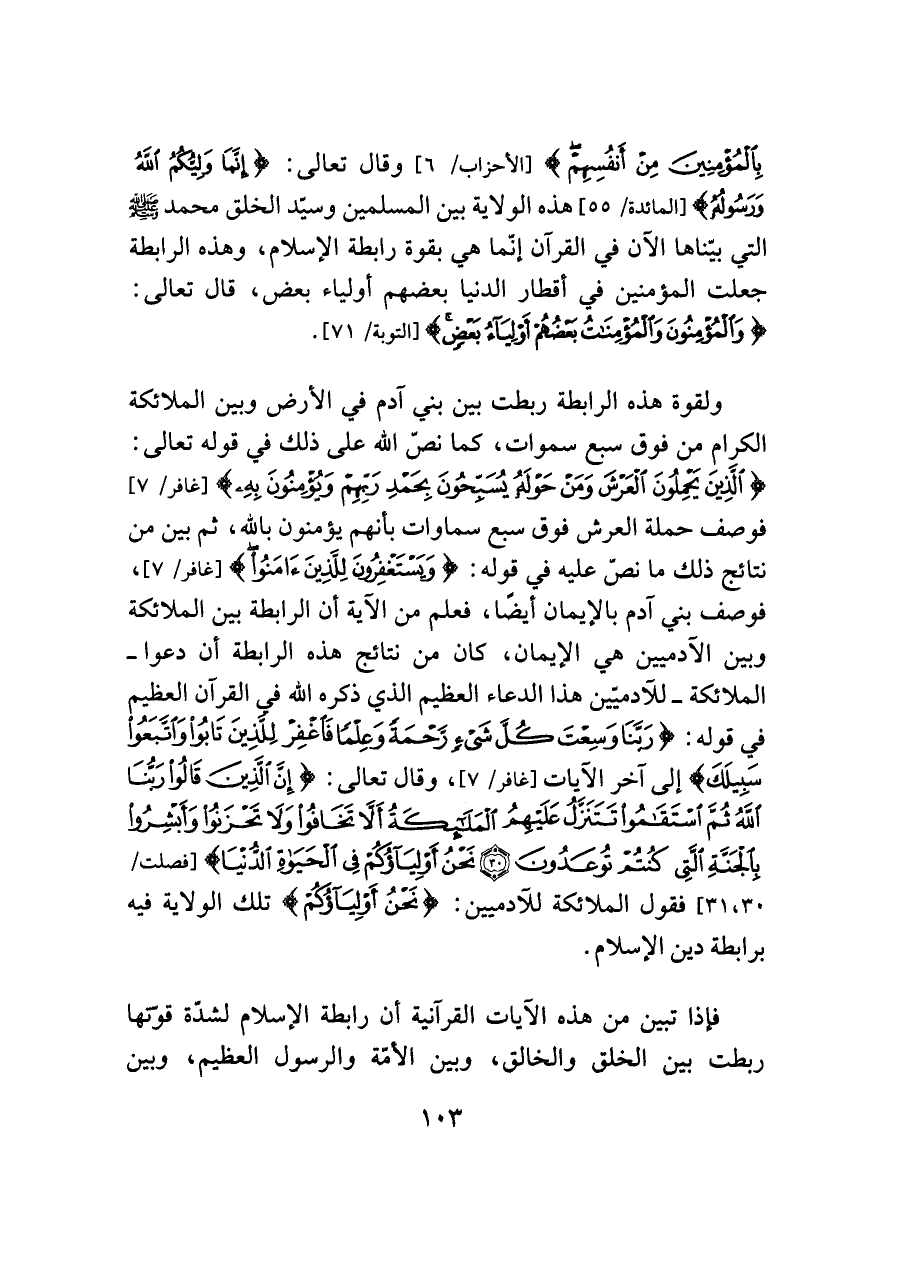 ولقوة هذه الرابطة ربطت بين بني آدم في الأرض وبين الملائكة الكرام من فوق سبع سموات، كما نصّ الله على ذلك في قوله تعالى: {الَّذِينَ يَحْمِلُونَ الْعَرْشَ وَمَنْ حَوْلَهُ يُسَبِّحُونَ بِحَمْدِ رَبِّهِمْ وَيُؤْمِنُونَ بِهِ} [غافر: ٧] فوصف حملة العرش فوق سبع سماوات بأنهم يؤمنون بالله، ثم بين من نتائج ذلك ما نصّ عليه في قوله: {وَيَسْتَغْفِرُونَ لِلَّذِينَ آمَنُوا} [غافر: ٧]، فوصف بني آدم بالإيمان أيضًا، فعلم من الآية أن الرابطة بين الملائكة وبين الآدميين هي الإيمان، كان من نتائج هذه الرابطة أن دعوا -الملائكة- للآدميّين هذا الدعاء العظيم الذي ذكره الله في القرآن العظيم في قوله: {رَبَّنَا وَسِعْتَ كُلَّ شَيءٍ رَحْمَةً وَعِلْمًا فَاغْفِرْ لِلَّذِينَ تَابُوا وَاتَّبَعُوا سَبِيلَكَ} إلى آخر الآيات [غافر / ٧]، وقال تعالى: {إِنَّ الَّذِينَ قَالُوا رَبُّنَا اللَّهُ ثُمَّ اسْتَقَامُوا تَتَنَزَّلُ عَلَيهِمُ الْمَلَائِكَةُ أَلَّا تَخَافُوا وَلَا تَحْزَنُوا وَأَبْشِرُوا بِالْجَنَّةِ الَّتِي كُنْتُمْ تُوعَدُونَ (٣٠) نَحْنُ أَوْلِيَاؤُكُمْ فِي الْحَيَاةِ الدُّنْيَا} [فصلت: ٣٠، ٣١] فقول الملائكة للآدميين: {نَحْنُ أَوْلِيَاؤُكُمْ} تلك الولاية فيه برابطة دين الإسلام.