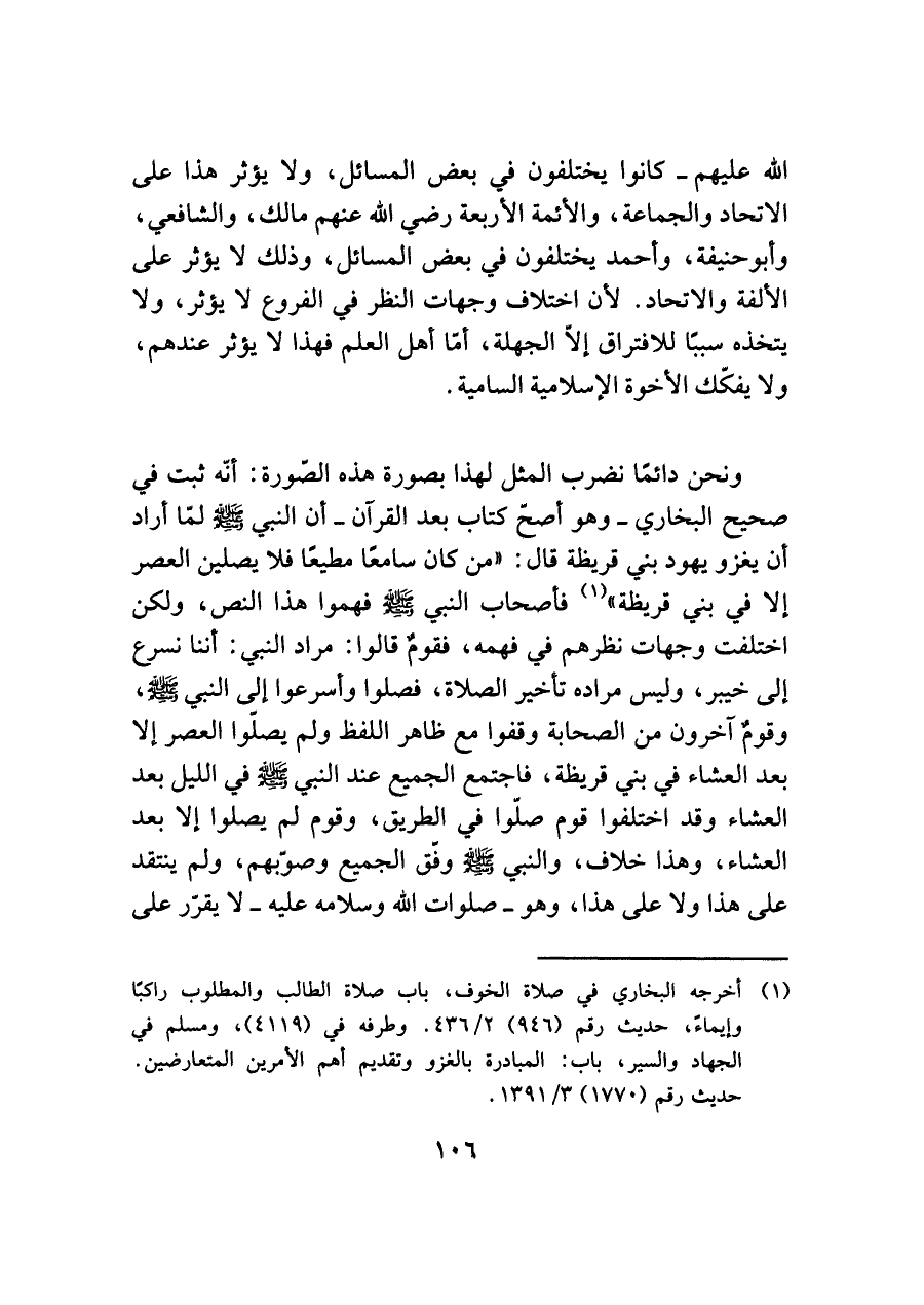 ونحن دائمًا نضرب المثل لهذا بصورة هذه الصّورة: أنّه ثبت في صحيح البخاري -وهو أصحّ كتاب بعد القرآن- أن النبي - صلى الله عليه وسلم - لمّا أراد أن يغزو يهود بني قريظة قال: "من كان سامعًا مطيعًا فلا يصلين العصر إلا في بني قريظة" (١) فأصحاب النبي - صلى الله عليه وسلم - فهموا هذا النص، ولكن اختلفت وجهات نظرهم في فهمه، فقومٌ قالوا: مراد النبي: أننا نسرع إلى خيبر، وليس مراده تأخير الصلاة، فصلوا وأسرعوا إلى النبي - صلى الله عليه وسلم -، وقومٌ آخرون من الصحابة وقفوا مع ظاهر اللفظ ولم يصلّوا العصر إلا بعد العشاء في بني قريظة، فاجتمع الجميع عند النبي - صلى الله عليه وسلم - في الليل بعد العشاء وقد اختلفوا قوم صلّوا في الطريق، وقوم لم يصلوا إلا بعد العشاء، وهذا خلاف، والنبي - صلى الله عليه وسلم - وفّق الجميع وصوّبهم، ولم ينتقد على هذا ولا على هذا، وهو -صلوات الله وسلامه عليه- لا يقرّر على