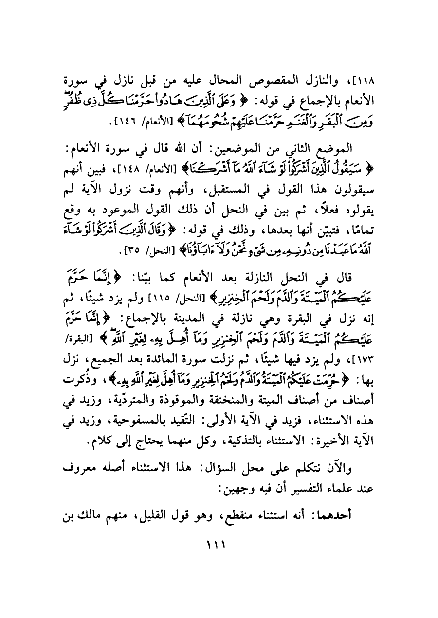 قال في النحل النازلة بعد الأنعام كما بيّنا: {إِنَّمَا حَرَّمَ عَلَيكُمُ الْمَيتَةَ وَالدَّمَ وَلَحْمَ الْخِنْزِيرِ} [النحل: ١١٥] ولم يزد شيئًا، ثم إنه نزل في البقرة وهي نازلة في المدينة بالإجماع: {إِنَّمَا حَرَّمَ عَلَيكُمُ الْمَيتَةَ وَالدَّمَ وَلَحْمَ الْخِنْزِيرِ وَمَا أُهِلَّ بِهِ لِغَيرِ اللَّهِ} [البقرة: ١٧٣]، ولم يزد فيها شيئًا، ثم نزلت سورة المائدة بعد الجميع، نزل بها: {حُرِّمَتْ عَلَيكُمُ الْمَيتَةُ وَالدَّمُ وَلَحْمُ الْخِنْزِيرِ وَمَا أُهِلَّ لِغَيرِ اللَّهِ بِهِ}، وذُكرت أصناف من أصناف الميتة والمنخنقة والموقوذة والمتردّية، وزيد في هذه الاستثناء، فزيد في الآية الأولى: التقيد بالمسفوحية، وزيد في الآية الأخيرة: الاستثناء بالتذكية، وكل منهما يحتاج إلى كلام.