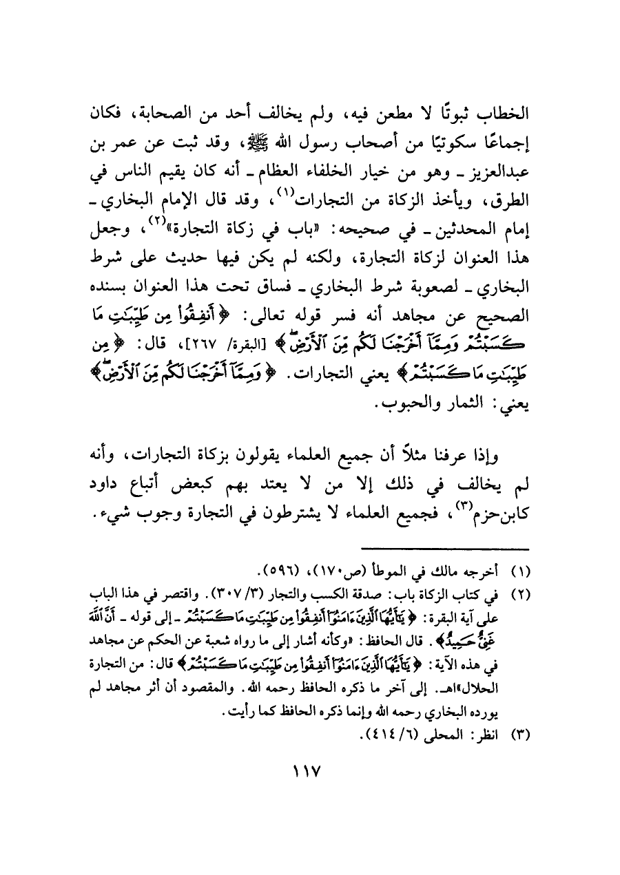 الخطاب ثبوتًا لا مطعن فيه، ولم يخالف أحد من الصحابة، فكان إجماعًا سكوتيًّا من أصحاب رسول الله - صلى الله عليه وسلم -، وقد ثبت عن عمر بن عبد العزيز -وهو من خيار الخلفاء العظام- أنه كان يقيم الناس في الطرق، ويأخذ الزكاة من التجارات (١)، وقد قال الإمام البخاري -إمام المحدثين- في صحيحه: "باب في زكاة التجارة" (٢)، وجعل هذا العنوان لزكاة التجارة، ولكنه لم يكن فيها حديث على شرط البخاري -لصعوبة شرط البخاري- فساق تحت هذا العنوان بسنده الصحيح عن مجاهد أنه فسر قوله تعالى: {أَنْفِقُوا مِنْ طَيِّبَاتِ مَا كَسَبْتُمْ وَمِمَّا أَخْرَجْنَا لَكُمْ مِنَ الْأَرْضِ} [البقرة: ٢٦٧]، قال: {مِنْ طَيِّبَاتِ مَا كَسَبْتُمْ} يعني التجارات. {وَمِمَّا أَخْرَجْنَا لَكُمْ مِنَ الْأَرْضِ} يعني: الثمار والحبوب.