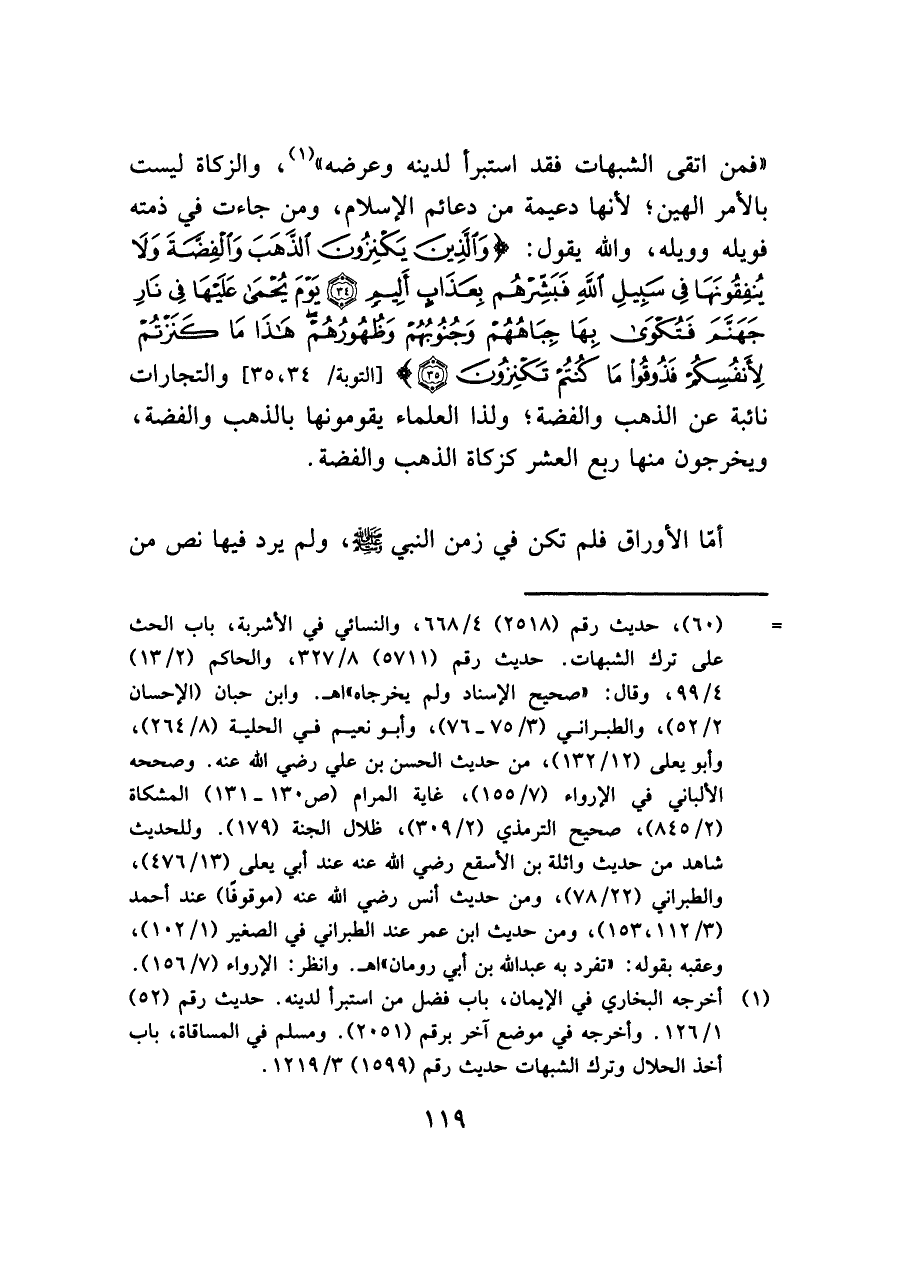 (١) أخرجه البخاري في الإيمان، باب فضل من استبرأ لدينه. حديث رقم (٥٢) ١/ ١٢٦. وأخرجه في موضع آخر برقم (٢٠٥١). ومسلم في المساقاة، باب أخذ الحلال وترك الشبهات حديث رقم (١٥٩٩) ٣/ ١٢١٩.