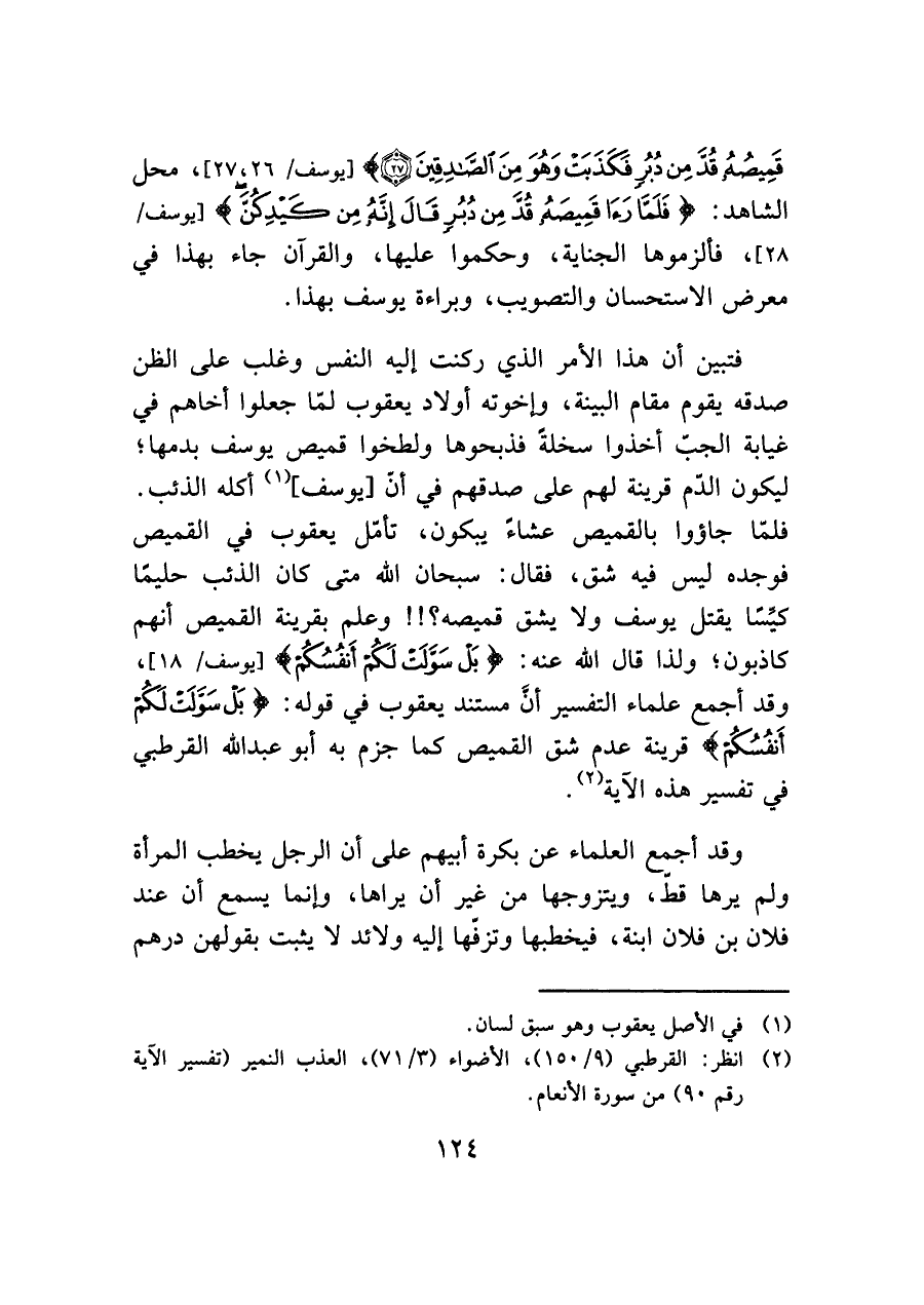فتبين أن هذا الأمر الذي ركنت إليه النفس وغلب على الظن صدقه يقوم مقام البينة، وإخوته أولاد يعقوب لمّا جعلوا أخاهم في غيابة الجبّ أخذوا سخلةً فذبحوها ولطخوا قميص يوسف بدمها، ليكون الدّم قرينة لهم على صدقهم في أنّ [يوسف] (١) أكله الذئب. فلمّا جاؤوا بالقميص عشاءً يبكون، تأمّل يعقوب في القميص فوجده ليس فيه شق، فقال: سبحان الله متى كان الذئب حليمًا كيِّسا يقتل يوسف ولا يشق قميصه؟ ! ! وعلم بقرينة القميص أنهم كاذبون؛ ولذا قال الله عنه: {بَلْ سَوَّلَتْ لَكُمْ أَنْفُسُكُمْ} [يوسف: ١٨]، وقد أجمع علماء التفسير أنَّ مستند يعقوب في قوله: {بَلْ سَوَّلَتْ لَكُمْ أَنْفُسُكُمْ} قرينة عدم شق القميص كما جزم به أبو عبد الله القرطبي في تفسير هذه الآية (٢).