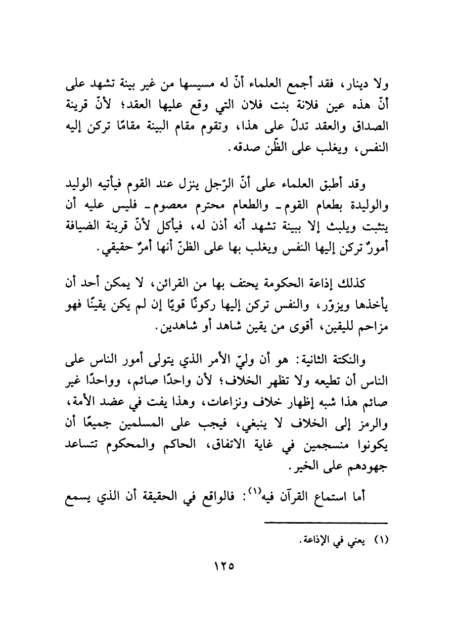 كذلك إذاعة الحكومة يحتف بها من القرائن، لا يمكن أحد أن يأخذها ويزوّر، والنفس تركن إليها ركونًا قويًّا إن لم يكن يقينًا فهو مزاحم لليقين، أقوى من يقين شاهد أو شاهدين.