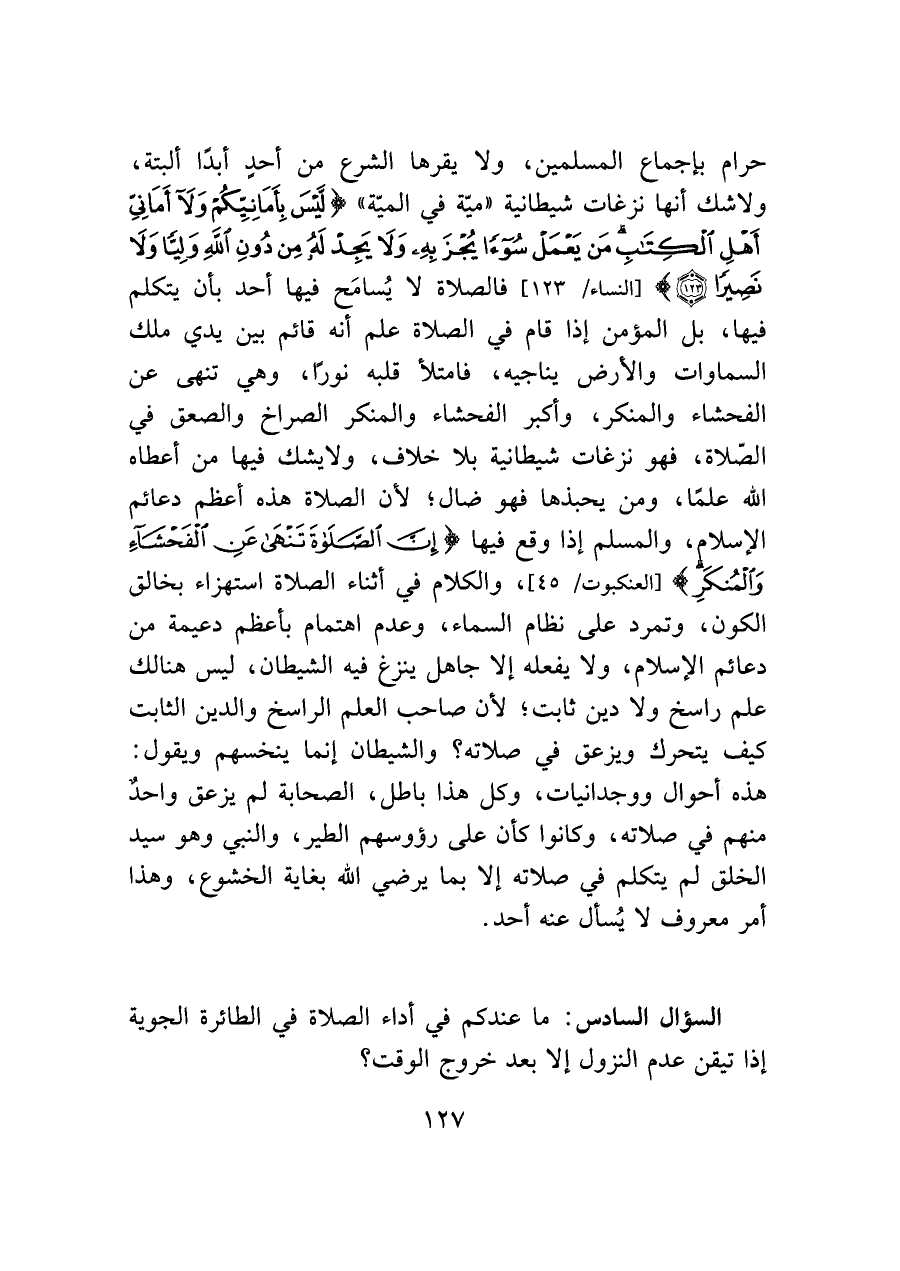 السؤال السادس: ما عندكم في أداء الصلاة في الطائرة الجوية إذا تيقن عدم النزول إلا بعد خروج الوقت؟