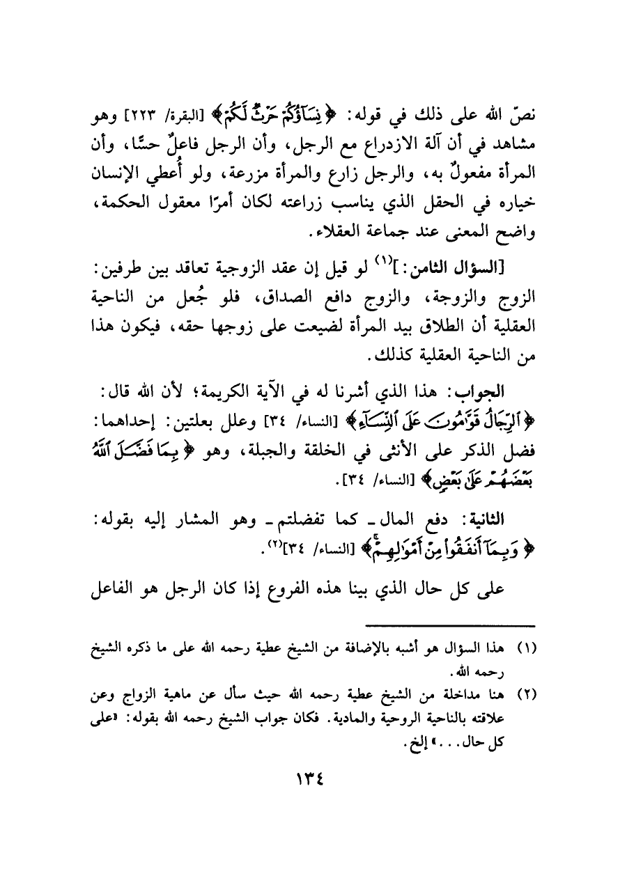 (٢) هنا مداخلة من الشيخ عطية رحمه الله حيث سأل عن ماهية الزواج وعن علاقته بالناحية الروحية والمادية. فكان جواب الشيخ رحمه الله بقوله: "على كل حال ... " إلخ.