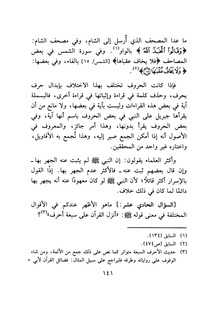 [السؤال الحادي عشر: ] ما هو الأظهر عندكم في الأقوال المختلفة في معنى قوله - صلى الله عليه وسلم -: "أنزل القرآن على سبعة أحرف" (٣)؟