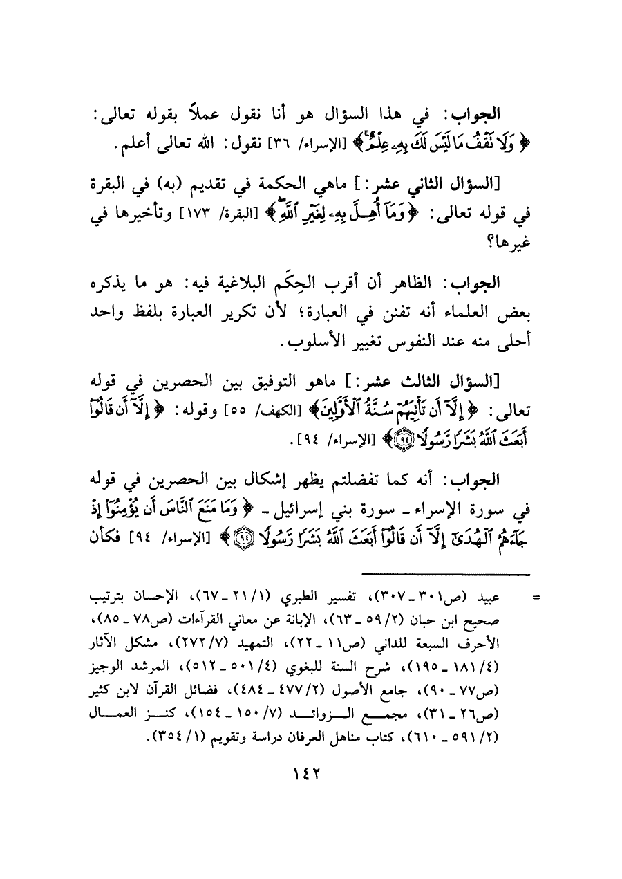 الجواب: أنه كما تفضلتم يظهر إشكال بين الحصرين في قوله في سورة الإسراء -سورة بني إسرائيل- {وَمَا مَنَعَ النَّاسَ أَنْ يُؤْمِنُوا إِذْ جَاءَهُمُ الْهُدَى إلا أَنْ قَالُوا أَبَعَثَ اللَّهُ بَشَرًا رَسُولًا (٩٤)} [الإسراء: ٩٤] فكأن