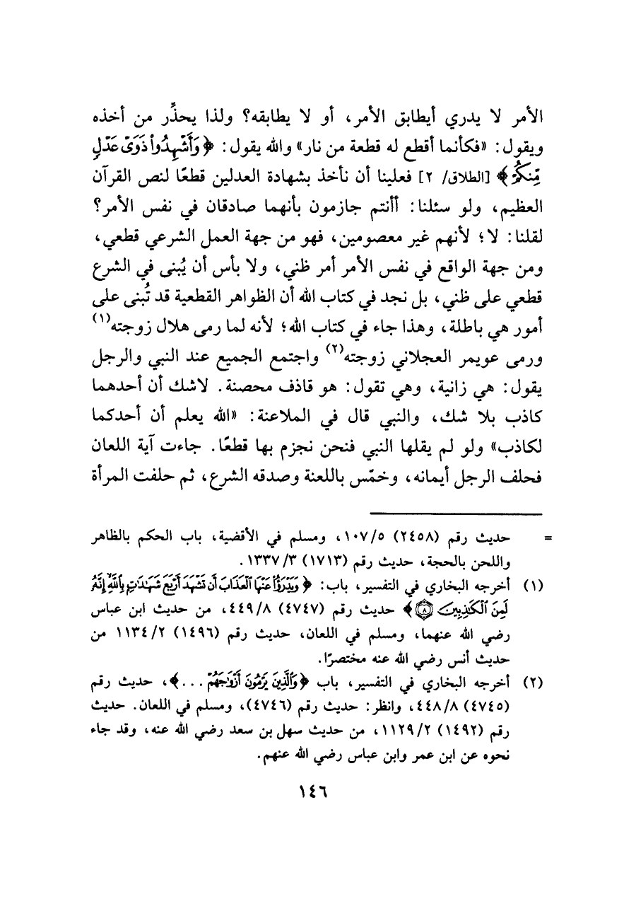 الأمر لا يدري أيطابق الأمر، أو لا يطابقه؟ ولذا يحذِّر من أخذه ويقول: "فكأنما أقطع له قطعة من نار" والله يقول: {وَأَشْهِدُوا ذَوَي عَدْلٍ مِنْكُمْ} [الطلاق: ٢] فعلينا أن نأخذ بشهادة العدلين قطعًا لنص القرآن العظيم، ولو سئلنا: أأنتم جازمون بأنهما صادقان في نفس الأمر؟ لقلنا: لا؛ لأنهم غير معصومين، فهو من جهة العمل الشرعي قطعي، ومن جهة الواقع في نفس الأمر أمر ظني، ولا بأس أن يُبنى في الشرع قطعي على ظني، بل نجد في كتاب الله أن الظواهر القطعية قد تُبنى على أمور هي باطلة، وهذا جاء في كتاب الله؛ لأنه لما رمى هلال زوجته (١) ورمى عويمر العجلاني زوجته (٢) واجتمع الجميع عند النبي والرجل يقول: هي زانية، وهي تقول: هو قاذف محصنة. لا شك أن أحدهما كاذب بلا شك، والنبي قال في الملاعنة: "الله يعلم أن أحدكما لكاذب" ولو لم يقلها النبي فنحن نجزم بها قطعًا. جاءت آية اللعان فحلف الرجل أيمانه، وخمّس باللعنة وصدقه الشرع، ثم حلفت المرأة