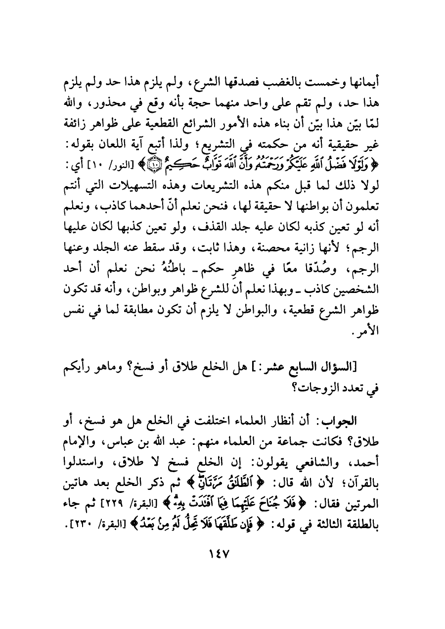 [السؤال السابع عشر: ] هل الخلع طلاق أو فسخ؟ وما هو رأيكم في تعدد الزوجات؟