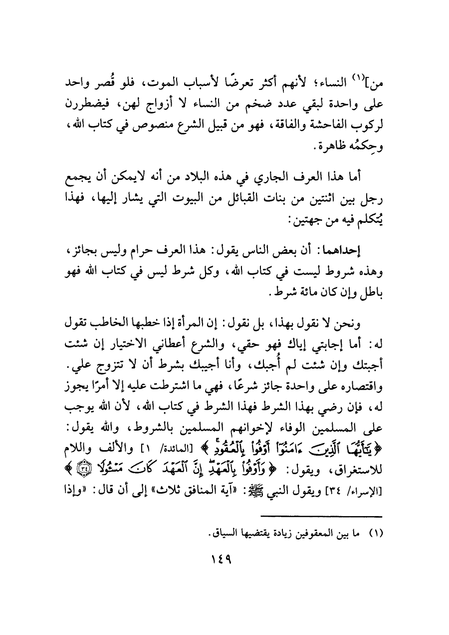 ونحن لا نقول بهذا، بل نقول: إن المرأة إذا خطبها الخاطب تقول له: أما إجابتي إياك فهو حقي، والشرع أعطاني الاختيار إن شئت أجبتك وإن شئت لم أُجبك، وأنا أجيبك بشرط أن لا تتزوج علي. واقتصاره على واحدة جائز شرعًا، فهي ما اشترطت عليه إلا أمرًا يجوز له، فإن رضي بهذا الشرط فهذا الشرط في كتاب الله، لأن الله يوجب على المسلمين الوفاء لإخوانهم المسلمين بالشروط، والله يقول: {يَا أَيُّهَا الَّذِينَ آمَنُوا أَوْفُوا بِالْعُقُودِ} [المائدة -١] والألف واللام للاستغراق، ويقول: {وَأَوْفُوا بِالْعَهْدِ إِنَّ الْعَهْدَ كَانَ مَسْئُولًا (٣٤)} [الإسراء: ٣٤] ويقول النبي - صلى الله عليه وسلم -: "آية المنافق ثلاث" إلى أن قال: "وإذا