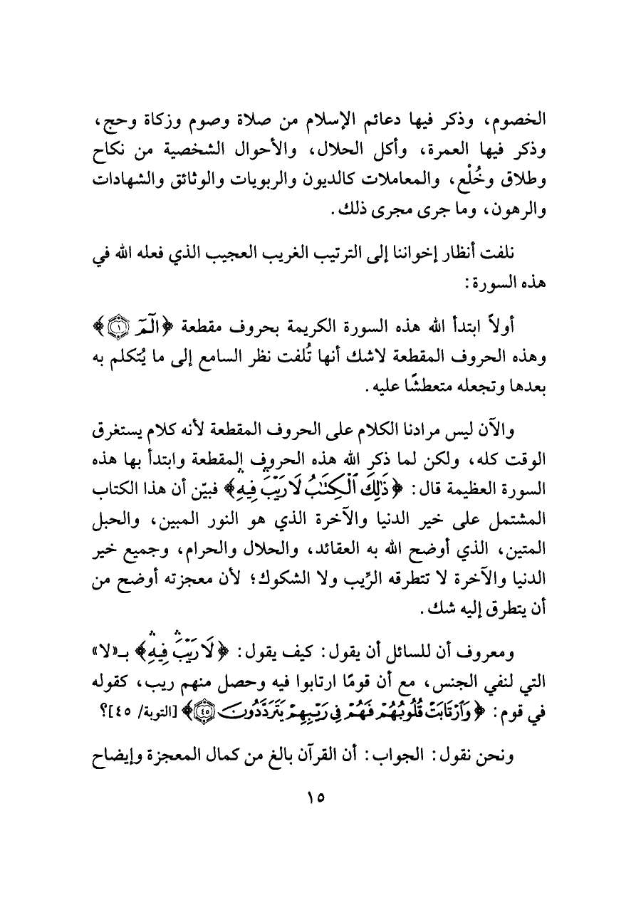 والآن ليس مرادنا الكلام على الحروف المقطعة لأنَّه كلام يستغرق الوقت كله، ولكن لما ذكر الله هذه الحروف المقطعة وابتدأ بها هذه السورة العظيمة قال: {ذَلِكَ الْكِتَابُ لَا رَيبَ فِيهِ} فبين أن هذا الكتاب المشتمل على خير الدُّنيا والآخرة الذي هو النور المبين، والحبل المتين، الذي أوضح الله به العقائد، والحلال والحرام، وجميع خير الدُّنيا والآخرة لا تتطرقه الرِّيب ولا الشكوك؛ لأنَّ معجزته أوضح من أن يتطرق إليه شك.
