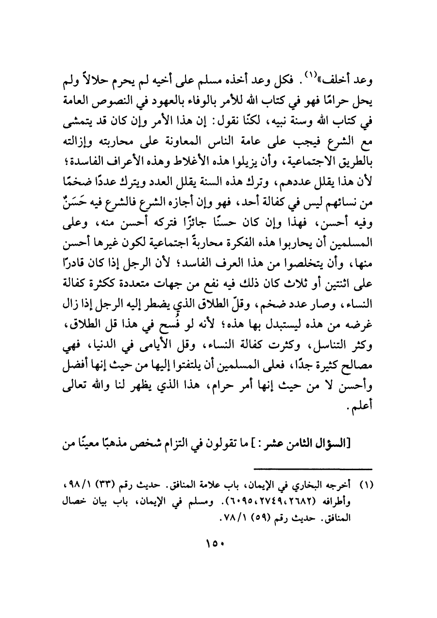 وعد أخلف" (١). فكل وعد أخذه مسلم على أخيه لم يحرم حلالًا ولم يحل حرامًا فهو في كتاب الله للأمر بالوفاء بالعهود في النصوص العامة في كتاب الله وسنة نبيه، لكنّا نقول: إن هذا الأمر وإن كان قد يتمشى مع الشرع فيجب على عامة الناس المعاونة على محاربته وإزالته بالطريق الاجتماعية، وأن يزيلوا هذه الأغلاط وهذه الأعراف الفاسدة؛ لأن هذا يقلل عددهم، وترك هذه السنة يقلل العدد ويترك عددًا ضخمًا من نسائهم ليس في كفالة أحد، فهو كان أجازه الشرع فالشرع فيه حَسَنٌ وفيه أحسن، فهذا وإن كان حسنًا جائزًا فتركه أحسن منه، وعلى المسلمين أن يحاربوا هذه الفكرة محاربةً اجتماعية لكون غيرها أحسن منها، وأن يتخلصوا من هذا العرف الفاسد؛ لأن الرجل إذا كان قادرًا على اثنتين أو ثلاث كان ذلك فيه نفع من جهات متعددة ككثرة كفالة النساء، وصار عدد ضخم، وقل الطلاق الذي يضطر إليه الرجل إذا زال غرضه من هذه ليستبدل بها هذه؛ لأنه لو فسح في هذا قل الطلاق، وكثر التناسل، وكثرت كفالة النساء، وقل الأيامى في الدنيا، فهي مصالح كثيرة جدًّا، فعلى المسلمين أن يلتفتوا إليها من حيث إنها أفضل وأحسن لا من حيث إنها أمر حرام، هذا الذي يظهر لنا والله تعالى أعلم.