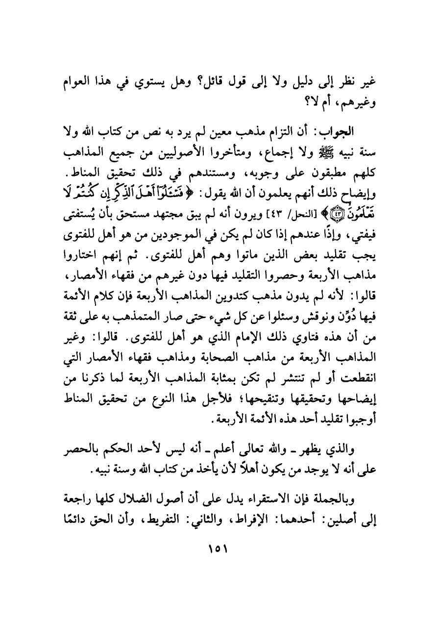 الجواب: أن التزام مذهب معين لم يرد به نص من كتاب الله ولا سنة نبيه - صلى الله عليه وسلم - ولا إجماع، ومتأخروا الأصوليين من جميع المذاهب كلهم مطبقون على وجوبه، ومستندهم في ذلك تحقيق المناط. وإيضاح ذلك أنهم يعلمون أن الله يقول: {فَاسْأَلُوا أَهْلَ الذِّكْرِ إِنْ كُنْتُمْ لَا تَعْلَمُونَ (٤٣)} [النحل: ٤٣] ويرون أنه لم يبق مجتهد مستحق بأن يُستفتى فيفتي، وإذًا عندهم إذا كان لم يكن في الموجودين من هو أهل للفتوى يجب تقليد بعض الذين ماتوا وهم أهل للفتوى. ثم إنهم اختاروا مذاهب الأربعة وحصروا التقليد فيها دون غيرهم من فقهاء الأمصار، قالوا: لأنه لم يدون مذهب كتدوين المذاهب الأربعة فإن كلام الأئمة فيها دُوِّن ونوقش وسئلوا عن كل شيء حتى صار المتمذهب به على ثقة من أن هذه فتاوي ذلك الإمام الذي هو أهل للفتوى. قالوا: وغير المذاهب الأربعة من مذاهب الصحابة ومذاهب فقهاء الأمصار التي انقطعت أو لم تنتشر لم تكن بمثابة المذاهب الأربعة لما ذكرنا من إيضاحها وتحقيقها وتنقيحها؛ فلأجل هذا النوع من تحقيق المناط أوجبوا تقليد أحد هذه الأئمة الأربعة.