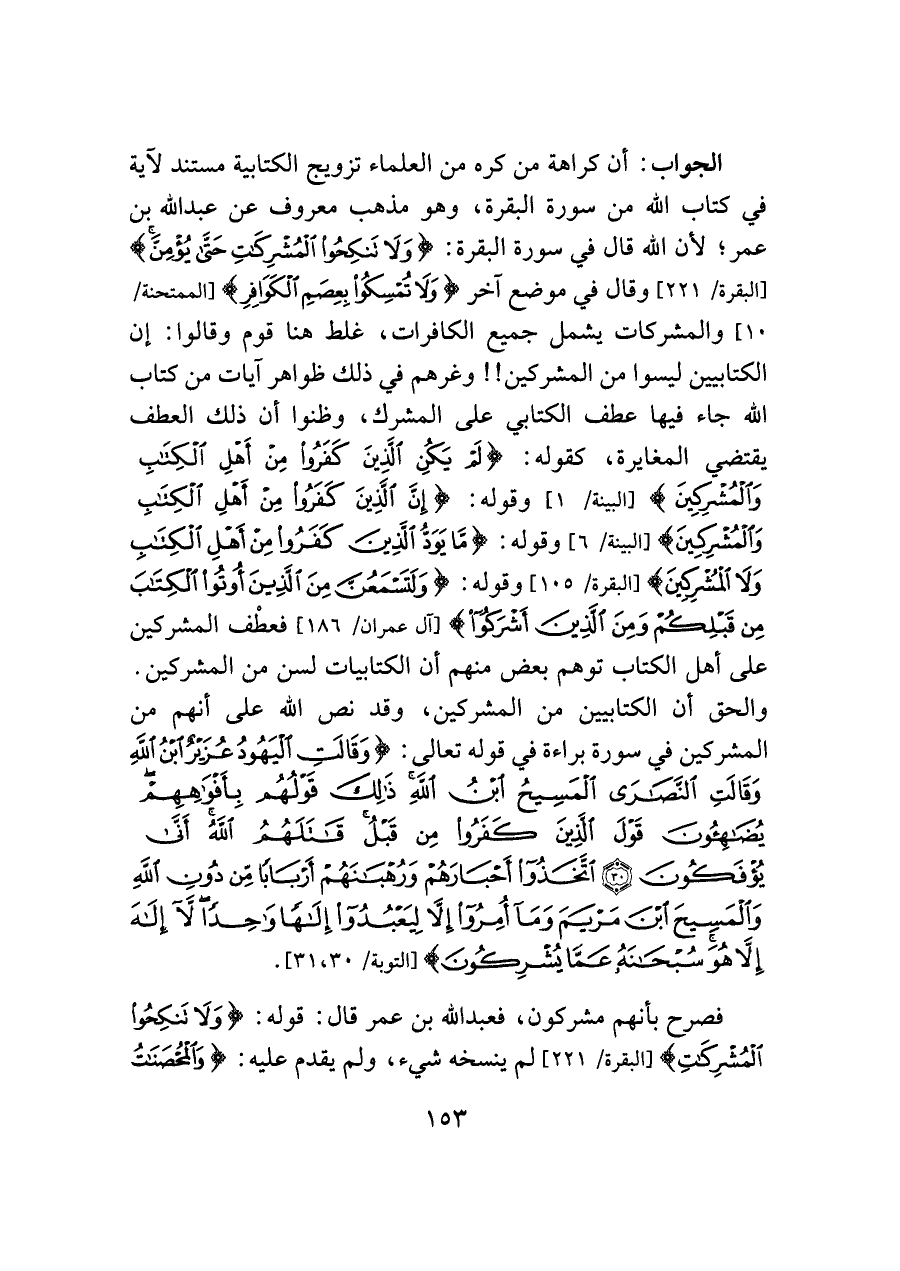 الجواب: أن كراهة من كره من العلماء تزويج الكتابية مستند الآية في كتاب الله من سورة البقرة، وهو مذهب معروف عن عبد الله بن عمر؛ لأن الله قال في سورة البقرة: {وَلَا تَنْكِحُوا الْمُشْرِكَاتِ حَتَّى يُؤْمِنَّ} [البقرة: ٢٢١] وقال في موضع آخر {وَلَا تُمْسِكُوا بِعِصَمِ الْكَوَافِر} [الممتحنة: ١٠] والمشركات يشمل جميع الكافرات، غلط هنا قوم وقالوا: إن الكتابيين ليسوا من المشركين! ! وغرهم في ذلك ظواهر آيات من كتاب الله جاء فيها عطف الكتابي على المشرك، وظنوا أن ذلك العطف يقتضي المغايرة، كقوله: {لَمْ يَكُنِ الَّذِينَ كَفَرُوا مِنْ أَهْلِ الْكِتَابِ وَالْمُشْرِكِينَ} [البينة - ١] وقوله: {إِنَّ الَّذِينَ كَفَرُوا مِنْ أَهْلِ الْكِتَابِ وَالْمُشْرِكِينَ} [البينة: ٦] وقوله: {مَا يَوَدُّ الَّذِينَ كَفَرُوا مِنْ أَهْلِ الْكِتَابِ وَلَا الْمُشْرِكِينَ} [البقرة: ١٠٥] وقوله: {وَلَتَسْمَعُنَّ مِنَ الَّذِينَ أُوتُوا الْكِتَابَ مِنْ قَبْلِكُمْ وَمِنَ الَّذِينَ أَشْرَكُوا} [آل عمران: ١٨٦] فعطْف المشركين على أهل الكتاب توهم بعض منهم أن الكتابيات لسن من المشركين. والحق أن الكتابيين من المشركين، وقد نص الله على أنهم من المشركين في سورة براءة في قوله تعالى: {وَقَالتِ الْيَهُودُ عُزَيرٌ ابْنُ اللَّهِ وَقَالتِ النَّصَارَى الْمَسِيحُ ابْنُ اللَّهِ ذَلِكَ قَوْلُهُمْ بِأَفْوَاهِهِمْ يُضَاهِئُونَ قَوْلَ الَّذِينَ كَفَرُوا مِنْ قَبْلُ قَاتَلَهُمُ اللَّهُ أَنَّى يُؤْفَكُونَ (٣٠) اتَّخَذُوا أَحْبَارَهُمْ وَرُهْبَانَهُمْ أَرْبَابًا مِنْ دُونِ اللَّهِ وَالْمَسِيحَ ابْنَ مَرْيَمَ وَمَا أُمِرُوا إلا لِيَعْبُدُوا إِلَهًا وَاحِدًا لَا إِلَهَ إلا هُوَ سُبْحَانَهُ عَمَّا يُشْرِكُونَ} [التوبة: ٣٠، ٣١].