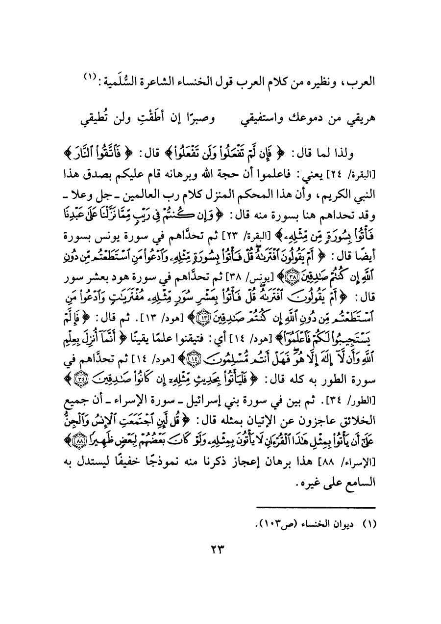 العرب، ونظيره من كلام العرب قول الخنساء الشاعرة السُّلَمية: (١)