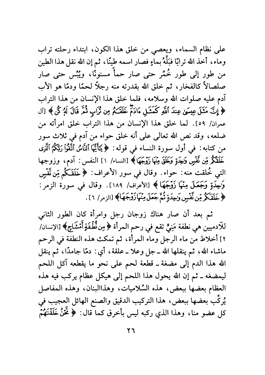 على نظام السماء، ويعصي من خلق هذا الكون، ابتداء رحلته تراب وماء، أخذ الله ترابًا فبَلَّهُ بماءٍ فصار اسمه طينًا، ثم إن الله نقل هذا الطين من طور إلى طور خُمر حتَّى صار حمأَ مسنونًا، ويُبس حتَّى صار صلصالًا كالفخار، ثم خلق الله بقدرته منه رجلًا لحمًا ودمًا هو الأب آدم عليه صلوات الله وسلامه، فلما خلق هذا الإنسان من هذا التُّراب {إِنَّ مَثَلَ عِيسَى عِنْدَ اللَّهِ كَمَثَلِ آدَمَ خَلَقَهُ مِنْ تُرَابٍ ثُمَّ قَال لَهُ كُنْ} [آل عمران / ٥٩]. لما خلق هذا الإنسان من هذا التُّراب خلق امرأته من ضلعه، وقد نص الله تعالى على أنَّه خلق حواء من آدم في ثلاث سور من كتابه: في أول سورة النساء في قوله: {يَا أَيُّهَا النَّاسُ اتَّقُوا رَبَّكُمُ الَّذِي خَلَقَكُمْ مِنْ نَفْسٍ وَاحِدَةٍ وَخَلَقَ مِنْهَا زَوْجَهَا} [النساء / ١] النَّفس: آدم، وزوجها التي خُلقت منه: حواء. وقال في سور الأعراف: {خَلَقَكُمْ مِنْ نَفْسٍ وَاحِدَةٍ وَجَعَلَ مِنْهَا زَوْجَهَا} [الأعراف / ١٨٩]. وقال في سورة الزمر: {خَلَقَكُمْ مِنْ نَفْسٍ وَاحِدَةٍ ثُمَّ جَعَلَ مِنْهَا زَوْجَهَا} [الزمر / ٦].