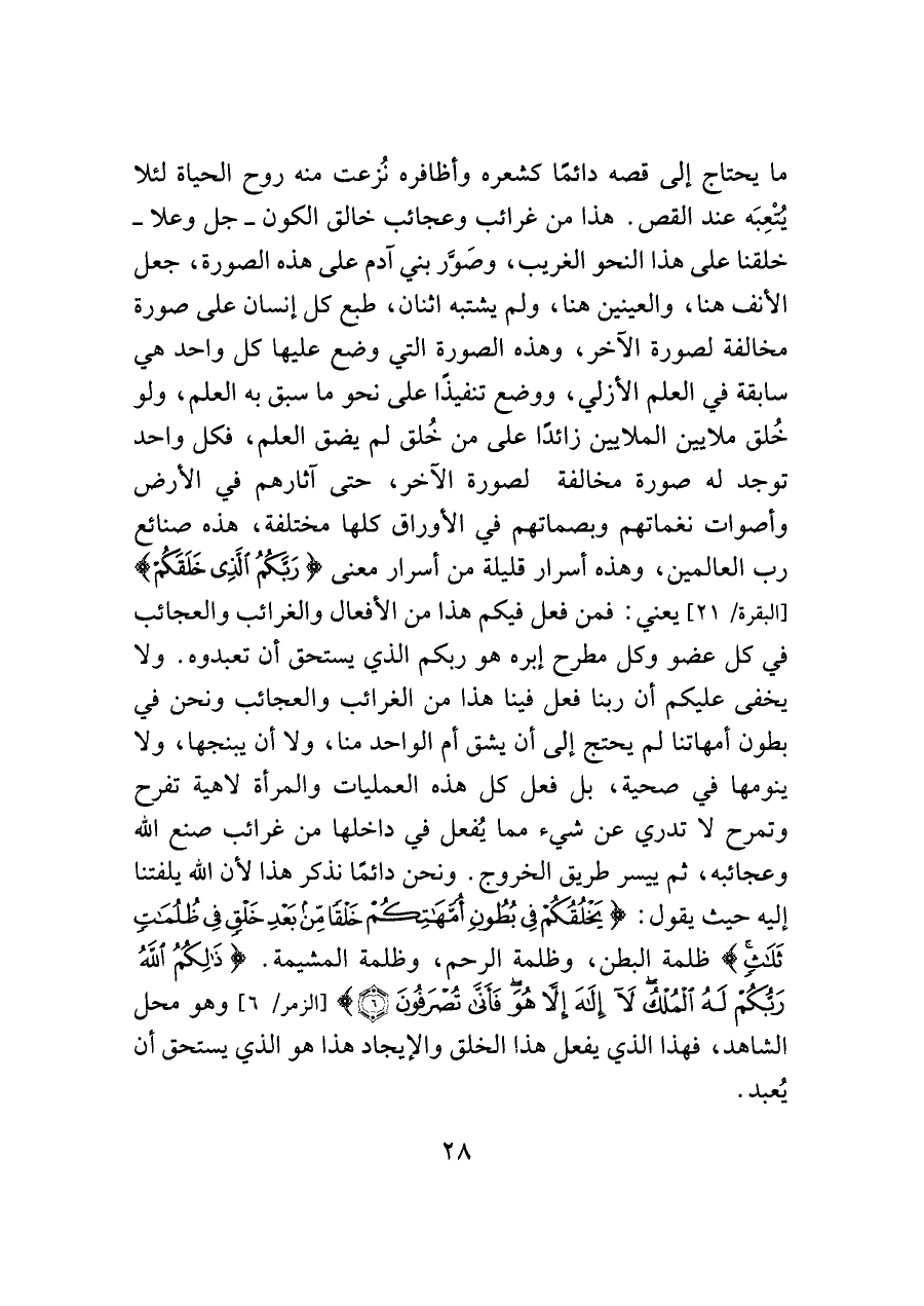 ما يحتاج إلى قصه دائمًا كشعره وأظافره نُزعت منه روح الحياة لئلا يتعِبَه عند القص. هذا من غرائب وعجائب خالق الكون -جل وعلا- خلقنا على هذا النحو الغريب، وصَور بني آدم على هذه الصورة، جعل الأنف هنا، والعينين هنا، ولم يشتبه اثنان، طبع كل إنسان على صورة مخالفة لصورة الآخر، وهذه الصورة التي وضع عليها كل واحد هي سابقة في العلم الأزلي، ووضع تنفيذًا على نحو ما سبق به العلم، ولو خُلق ملايين الملايين زائدًا على من خُلق لم يضق العلم، فكل واحد توجد له صورة مخالفة لصورة الآخر، حتَّى آثارهم في الأرض وأصوات نغماتهم وبصماتهم في الأوراق كلها مختلفة، هذه صنائع رب العالمين، وهذه أسرار قليلة من أسرار معنى {رَبَّكُمُ الَّذِي خَلَقَكُمْ} [البقرة / ٢١] يعني: فمن فعل فيكم هذا من الأفعال والغرائب والعجائب في كل عضو وكل مطرح إبره هو ربكم الذي يستحق أن تعبدوه. ولا يخفى عليكم أن ربنا فعل فينا هذا من الغرائب والعجائب ونحن في بطون أمهاتنا لم يحتج إلى أن يشق أم الواحد منا، ولا أن يبنجها، ولا ينومها في صحية، بل فعل كل هذه العمليات والمرأة لاهية تفرح وتمرح لا تدري عن شيء مما يُفعل في داخلها من غرائب صنع الله وعجائبه، ثم ييسر طريق الخروج. ونحن دائمًا نذكر هذا لأن الله يلفتنا إليه حيث يقول: {يَخْلُقُكُمْ فِي بُطُونِ أُمَّهَاتِكُمْ خَلْقًا مِنْ بَعْدِ خَلْقٍ فِي ظُلُمَاتٍ ثَلَاثٍ} ظلمة البطن، وظلمة الرحم، وظلمة المشيمة. {ذَلِكُمُ اللَّهُ رَبُّكُمْ لَهُ الْمُلْكُ لَا إِلَهَ إلا هُوَ فَأَنَّى تُصْرَفُونَ (٦)} [الزمر / ٦] وهو محل الشاهد، فهذا الذي يفعل هذا الخلق والإيجاد هذا هو الذي يستحق أن يُعبد.