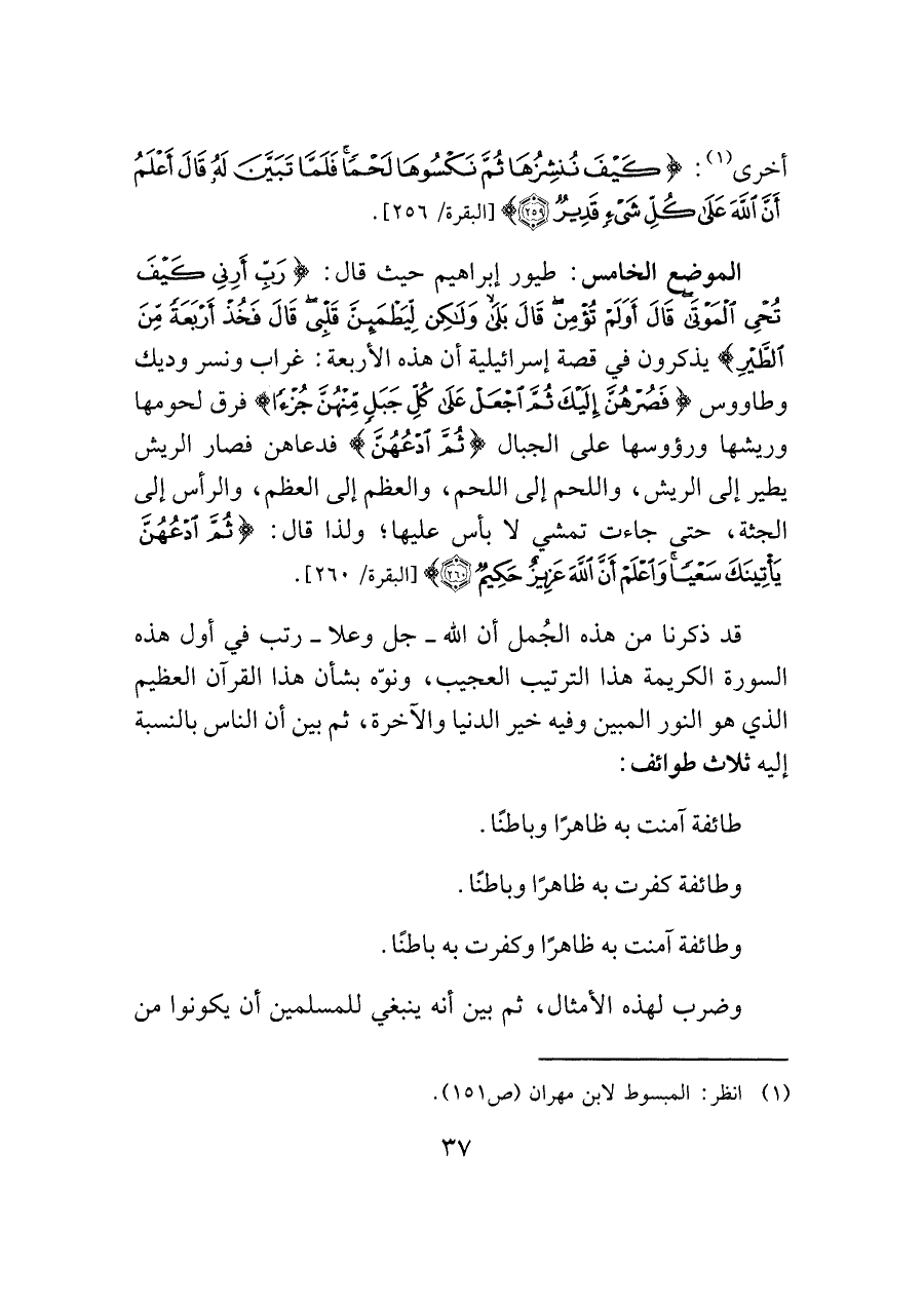 الموضع الخامس: طيور إبراهيم حيث قال {رَبِّ أَرِنِي كَيفَ تُحْيِ الْمَوْتَى قَال أَوَلَمْ تُؤْمِنْ قَال بَلَى وَلَكِنْ لِيَطْمَئِنَّ قَلْبِي قَال فَخُذْ أَرْبَعَةً مِنَ الطَّيرِ} يذكرون في قصَّة إسرائيلية أن هذه الأربعة: غراب ونسر وديك وطاووس {فَصُرْهُنَّ إِلَيكَ ثُمَّ اجْعَلْ عَلَى كُلِّ جَبَلٍ مِنْهُنَّ جُزْءًا} فرق لحومها وريشها ورؤوسها على الجبال {ثُمَّ ادْعُهُنَّ} فدعاهن فصار الريش يطير إلى الريش، واللحم إلى اللحم، والعظم إلى العظم، والرأس إلى الجثة، حتَّى جاءت تمشي لا بأس عليها؛ ولذا قال: {ثُمَّ ادْعُهُنَّ يَأْتِينَكَ سَعْيًا وَاعْلَمْ أَنَّ اللَّهَ عَزِيزٌ حَكِيمٌ (٢٦٠)} [البقرة / ٢٦٠].