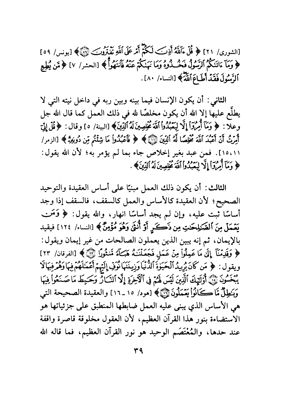 الثالث: أن يكون ذلك العمل مبنيًّا علي أساس العقيدة والتوحيد الصحيح؛ لأنَّ العقيدة كالأساس والعمل كالسقف، فالسقف إذا وجد أساسًا ثبت عليه، وإن لم يجد أساسًا انهار، والله يقول: {وَمَنْ يَعْمَلْ مِنَ الصَّالِحَاتِ مِنْ ذَكَرٍ أَوْ أُنْثَى وَهُوَ مُؤْمِنٌ} [النساء / ١٢٤] فيقيد بالإيمان، ثم إنَّه يبين الذين يعملون الصالحات من غير إيمان ويقول: {وَقَدِمْنَا إِلَى مَا عَمِلُوا مِنْ عَمَلٍ فَجَعَلْنَاهُ هَبَاءً مَنْثُورًا (٢٣)} [الفرقان / ٢٣] ويقول: {مَنْ كَانَ يُرِيدُ الْحَيَاةَ الدُّنْيَا وَزِينَتَهَا نُوَفِّ إِلَيهِمْ أَعْمَالهُمْ فِيهَا وَهُمْ فِيهَا لَا يُبْخَسُونَ (١٥) أُولَئِكَ الَّذِينَ لَيسَ لَهُمْ فِي الْآخِرَةِ إلا النَّارُ وَحَبِطَ مَا صَنَعُوا فِيهَا وَبَاطِلٌ مَا كَانُوا يَعْمَلُونَ (١٦)} [هود / ١٥ - ١٦] والعقيدة الصحيحة التي هي الأساس الذي يبنى عليه العمل ضابطها المنطبق علي جزئياتها هو الاستضاءة بنور هذا القرآن العظيم، لأنَّ العقول مخلوقة قاصرة واقفة عند حدها، والمُعتصَم الوحيد هو نور القرآن العظيم، فما قاله الله