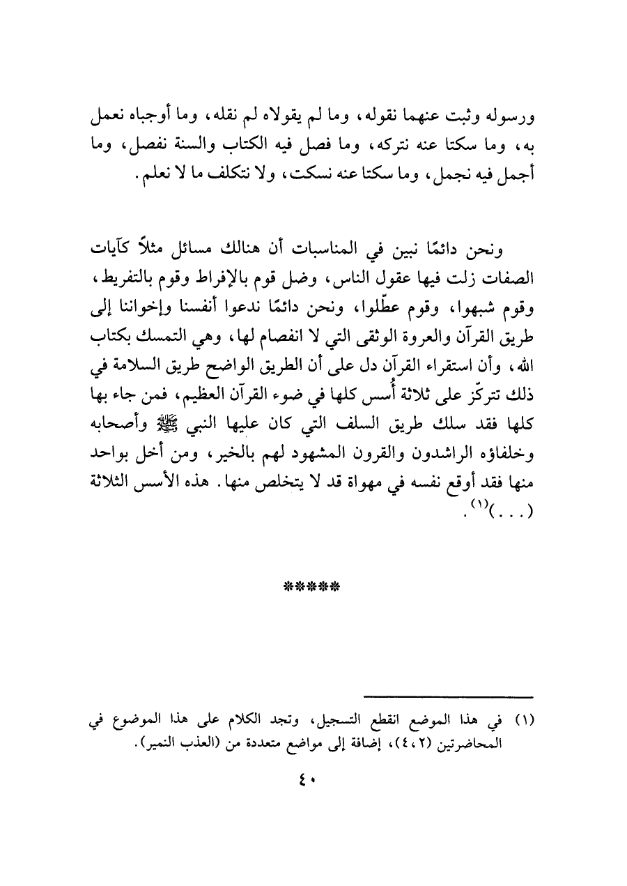 ونحن دائمًا نبين في المناسبات أن هنالك مسائل مثلًا كآيات الصفات زلت فيها عقول النَّاس، وضل قوم بالإفراط وقوم بالتفريط، وقوم شبهوا، وقوم عطّلوا، ونحن دائمًا ندعوا أنفسنا وإخواننا إلى طريق القرآن والعروة الوثقى التي لا انفصام لها، وهي التمسك بكتاب الله، وأن استقراء القرآن دل على أن الطَّريق الواضح طريق السلامة في ذلك تتركّز على ثلاثة أُسس كلها في ضوء القرآن العظيم، فمن جاء بها كلها فقد سلك طريق السلف التي كان عليها النَّبيُّ - صَلَّى الله عليه وسلم - وأصحابه وخلفاؤه الراشدون والقرون المشهود لهم بالخير، ومن أخل بواحد منها فقد أوقع نفسه في مهواة قد لا يتخلص منها. هذه الأسس الثلاثة ( ... ) (١).