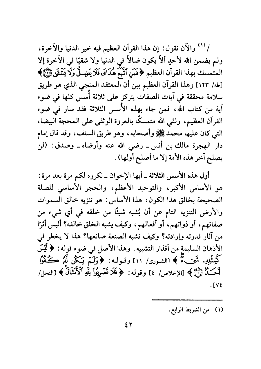 (١) والآن نقول: إن هذا القرآن العظيم فيه خير الدُّنيا والآخرة، ولم يضمن الله لأحدٍ ألّا يكون ضالًا في الدُّنيا ولا شقيًّا في الآخرة إلَّا المتمسك بهذا القرآن العظيم {فَمَنِ اتَّبَعَ هُدَايَ فَلَا يَضِلُّ وَلَا يَشْقَى (١٢٣)} [طه / ١٢٣] وهذا القرآن العظيم بين أن المعتقد المنجي الذي هو طريق سلامة محققة في آيات الصفات يتركز على ثلاثة أُسس كلها في ضوء آية من كتاب الله، فمن جاء بهذه الأسس الثلاثة فقد سار في ضوء القرآن العظيم، ولقي الله متمسكًا بالعروة الوثقى على المحجة البيضاء التي كان عليها محمد - صلى الله عليه وسلم - وأصحابه، وهو طريق السلف، وقد قال إمام دار الهجرة مالك بن أنس - رضي الله عنه وأرضاه- وصدق: (لن يصلح آخر هذه الأمة إلَّا ما أصلح أولها).