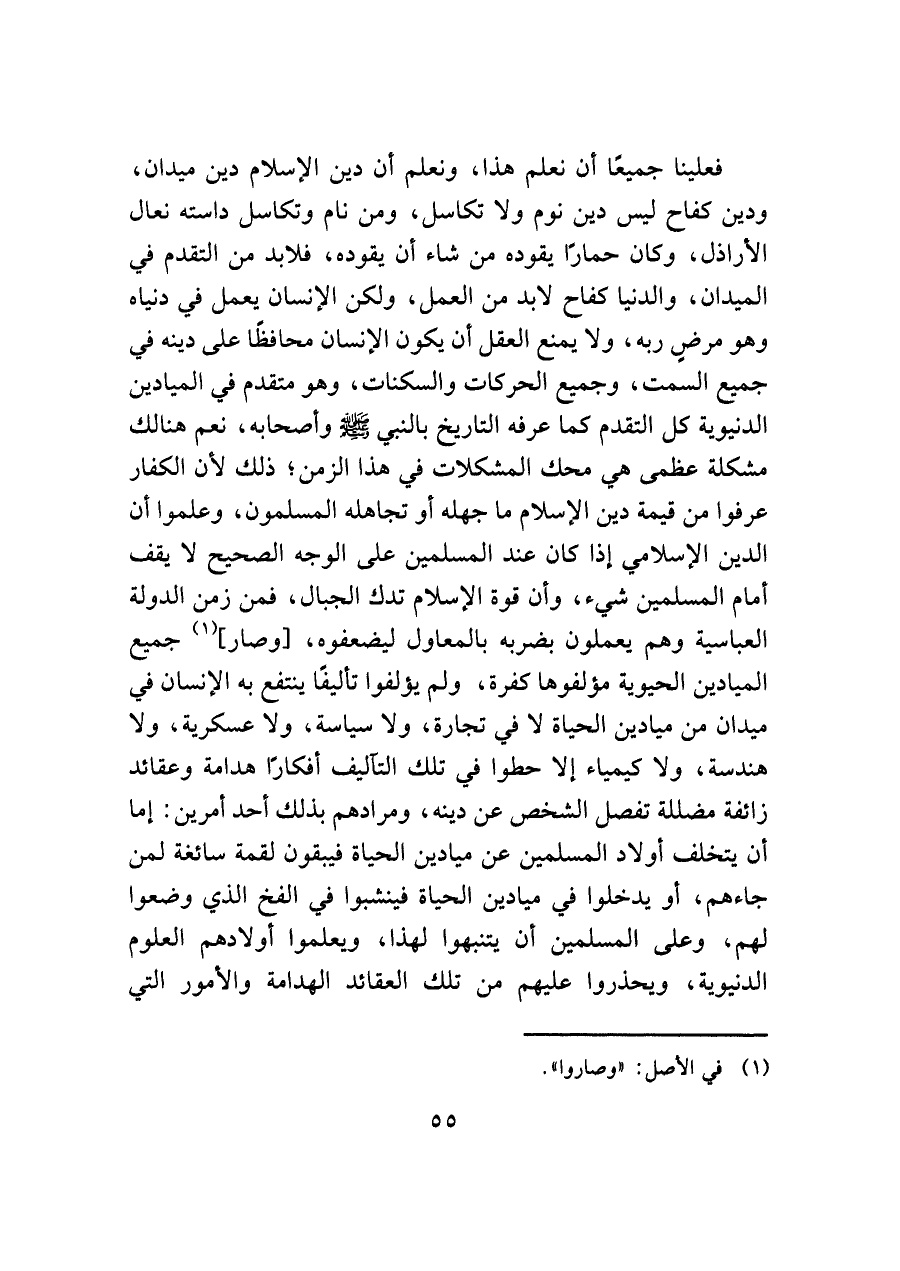 فعلينا جميعًا أن نعلم هذا، ونعلم أن دين الإسلام دين ميدان، ودين كفاح ليس دين نوم ولا تكاسل، ومن نام وتكاسل داسته نعال الأراذل، وكان حمارًا يقوده من شاء أن يقوده، فلا بد من التقدم في الميدان، والدنيا كفاح لا بد من العمل، ولكن الإنسان يعمل في دنياه وهو مرضٍ ربه، ولا يمنع العقل أن يكون الإنسان محافظًا على دينه في جميع السمت، وجميع الحركات والسكنات، وهو متقدم في الميادين الدنيوية كل التقدم كما عرفه التاريخ بالنبي - صلى الله عليه وسلم - وأصحابه، نعم هنالك مشكلة عظمى هي محك المشكلات في هذا الزمن؛ ذلك لأن الكفار عرفوا من قيمة دين الإسلام ما جهله أو تجاهله المسلمون، وعلموا أن الدين الإسلامي إذا كان عند المسلمين على الوجه الصحيح لا يقف أمام المسلمين شيء، وأن قوة الإسلام تدك الجبال، فمن زمن الدولة العباسية وهم يعملون بضربه بالمعاول ليضعفوه، [وصار] (١) جميع الميادين الحيوية مؤلفوها كفرة، ولم يؤلفوا تأليفًا ينتفع به الإنسان في ميدان من ميادين الحياة لا في تجارة، ولا سياسة، ولا عسكرية، ولا هندسة، ولا كيمياء إلا حطوا في تلك التآليف أفكارًا هدامة وعقائد زائفة مضللة تفصل الشخص عن دينه، ومرادهم بذلك أحد أمرين: إما أن يتخلف أولاد المسلمين عن ميادين الحياة فيبقون لقمة سائغة لمن جاءهم، أو يدخلوا في ميادين الحياة فينشبوا في الفخ الذي وضعوا لهم، وعلى المسلمين أن يتنبهوا لهذا، ويعلموا أولادهم العلوم الدنيوية، ويحذروا عليهم من تلك العقائد الهدامة والأمور التي