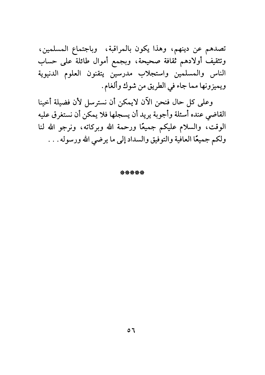 وعلى كل حال فنحن الآن لا يمكن أن نسترسل لأن فضيلة أخينا القاضي عنده أسئلة وأجوبة يريد أن يسجلها فلا يمكن أن نستغرق عليه الوقت، والسلام عليكم جميعًا ورحمة الله وبركاته، ونرجو الله لنا ولكم جميعًا العافية والتوفيق والسداد إلى ما يرضي الله ورسوله ...