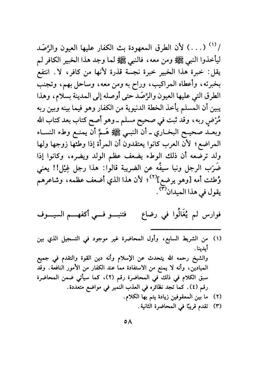 (١) ( ... ) لأن الطرق المعهودة بث الكفار عليها العيون والرَّصَد ليأخذوا النبي - صلى الله عليه وسلم - ومن معه، فالنبي - صلى الله عليه وسلم - لما وجد هذا الخبير الكافر لم يقل: خبرة هذا الخبير خبرة نجسة قذرة لأنها من كافر، لا. انتفع بخبرته، وأعطاه المراكيب، وراح به ومن معه، وساحل بهم، وتجنب الطرق التي عليها العيون والرَّصَد حتى أوصله إلى المدينة بسلام، وهذا يبين أن المسلم يأخذ الخطة الدنيوية من الكفار وهو فيما بينه وبين ربه مُرْضٍ ربه، وقد ثبت في صحيح مسلم -وهو أصح كتاب بعد كتاب الله وبعد صحيح البخاري- أن النبي - صلى الله عليه وسلم - هَمَّ أن يمنع وطء النساء المراضع؛ لأن العرب كانوا يعتقدون أن المرأة إذا وطئها زوجها ولها ولد ترضعه أن ذلك الوطء يضعف عظم الولد ويضره، وكانوا إذا ضَرَب الرجل ونبا سيفُه عن الضريبة قالوا: هذا رجل غِيل! ! يعني وُطئت أمه [وهو يرضع] (٢)؛ لأن هذا الذي أضعف عظمه، وشاعرهم يقول في هذا الميدان (٣).