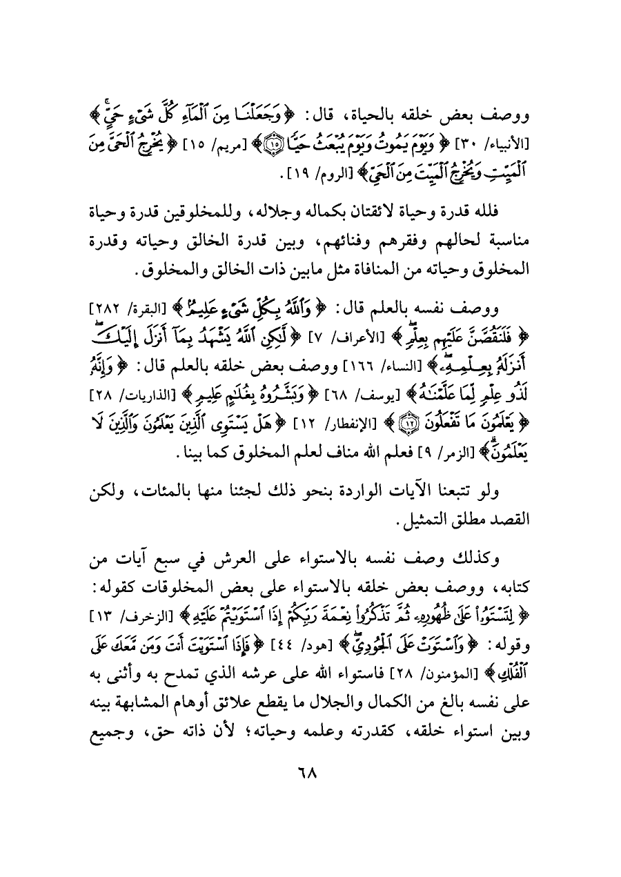 وكذلك وصف نفسه بالاستواء على العرش في سبع آيات من كتابه، ووصف بعض خلقه بالاستواء على بعض المخلوقات كقوله: {لِتَسْتَوُوا عَلَى ظُهُورِهِ ثُمَّ تَذْكُرُوا نِعْمَةَ رَبِّكُمْ إِذَا اسْتَوَيتُمْ عَلَيهِ} [الزخرف: ١٣] وقوله: {وَاسْتَوَتْ عَلَى الْجُودِيِّ} [هود: ٤٤] {فَإِذَا اسْتَوَيتَ أَنْتَ وَمَنْ مَعَكَ عَلَى الْفُلْكِ} [المؤمنون: ٢٨] فاستواء الله على عرشه الذي تمدح به وأثنى به على نفسه بالغ من الكمال والجلال ما يقطع علائق أوهام المشابهة بينه وبين استواء خلقه، كقدرته وعلمه وحياته؛ لأن ذاته حق، وجميع