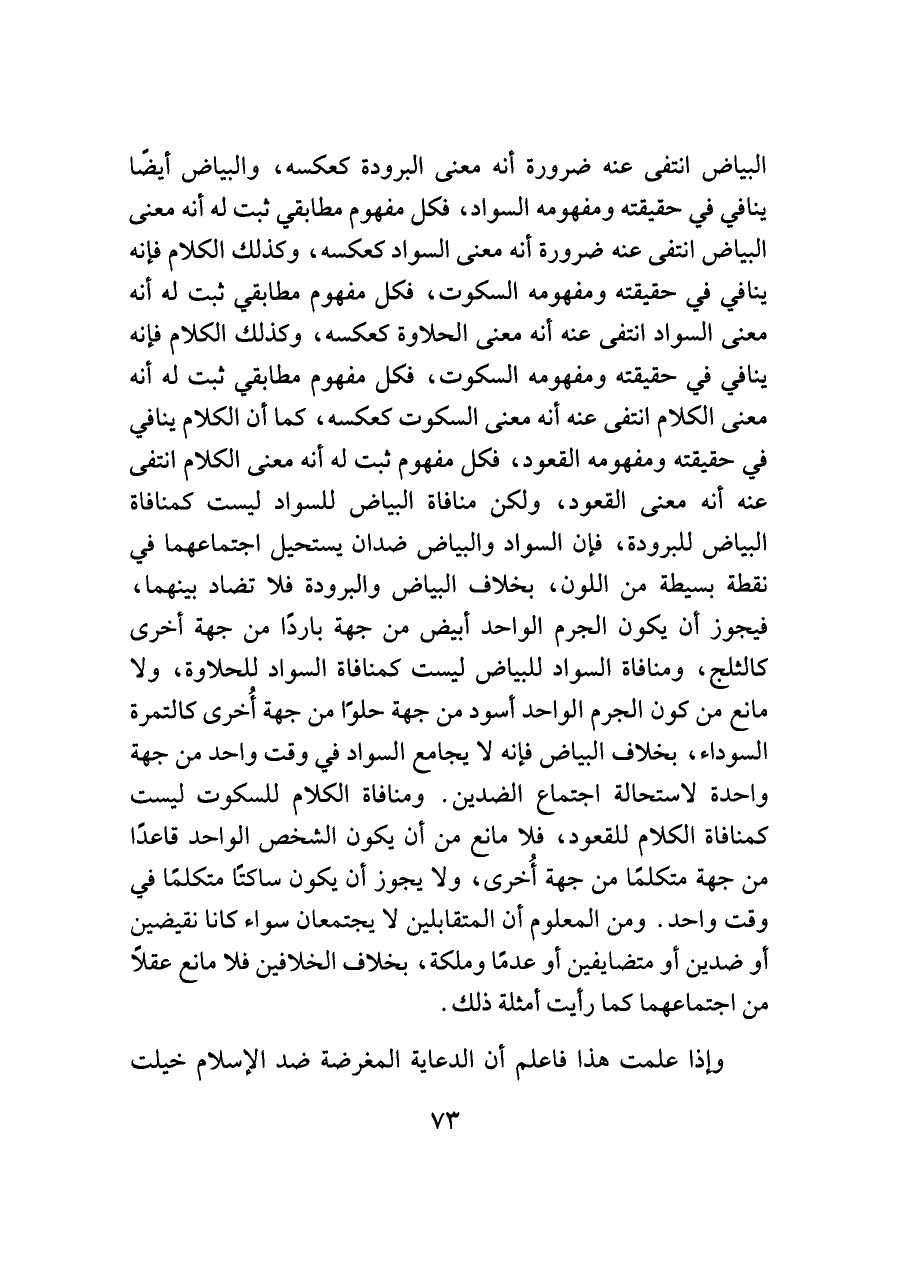 البياض انتفى عنه ضرورة أنه معنى البرودة كعكسه، والبياض أيضًا ينافي في حقيقته ومفهومه السواد، فكل مفهوم مطابقي ثبت له أنه معنى البياض انتفى عنه ضرورة أنه معنى السواد كعكسه، وكذلك الكلام فإنه ينافي في حقيقته ومفهومه السكوت، فكل مفهوم مطابقي ثبت له أنه معنى السواد انتفى عنه أنه معنى الحلاوة كعكسه، وكذلك الكلام فإنه ينافي في حقيقته ومفهومه السكوت، فكل مفهوم مطابقي ثبت له أنه معنى الكلام انتفى عنه أنه معنى السكوت كعكسه، كما أن الكلام ينافي في حقيقته ومفهومه القعود، فكل مفهوم ثبت له أنه معنى الكلام انتفى عنه أنه معنى القعود، ولكن منافاة البياض للسواد ليست كمنافاة البياض للبرودة، فإن السواد والبياض ضدان يستحيل اجتماعهما في نقطة بسيطة من اللون، بخلاف البياض والبرودة فلا تضاد بينهما، فيجوز أن يكون الجرم الواحد أبيض من جهة باردًا من جهة أخرى كالثلج، ومنافاة السواد للبياض ليست كمنافاة السواد للحلاوة، ولا مانع من كون الجرم الواحد أسود من جهة حلوًا من جهة أُخرى كالتمرة السوداء، بخلاف البياض فإنه لا يجامع السواد في وقت واحد من جهة واحدة لاستحالة اجتماع الضدين. ومنافاة الكلام للسكوت ليست كمنافاة الكلام للقعود، فلا مانع من أن يكون الشخص الواحد قاعدًا من جهة متكلمًا من جهة أُخرى، ولا يجوز أن يكون ساكتًا متكلمًا في وقت واحد. ومن المعلوم أن المتقابلين لا يجتمعان سواء كانا نقيضين أو ضدين أو متضايفين أو عدمًا وملكة، بخلاف الخلافين فلا مانع عقلًا من اجتماعهما كما رأيت أمثلة ذلك.