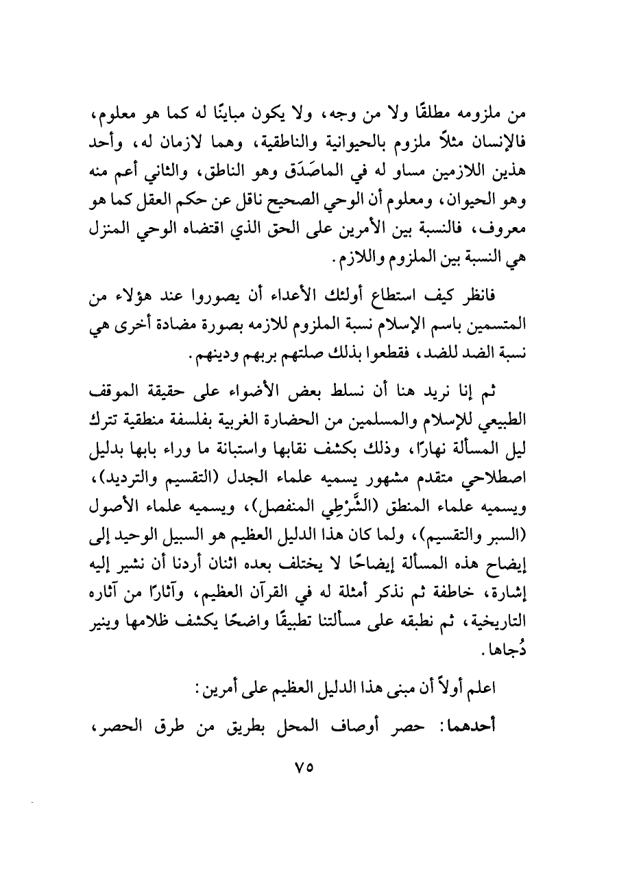 ثم إنا نريد هنا أن نسلط بعض الأضواء على حقيقة الموقف الطبيعي للإسلام والمسلمين من الحضارة الغربية بفلسفة منطقية تترك ليل المسألة نهارًا، وذلك بكشف نقابها واستبانة ما وراء بابها بدليل اصطلاحي متقدم مشهور يسميه علماء الجدل (التقسيم والترديد)، ويسميه علماء المنطق (الشَّرْطِي المنفصل)، ويسميه علماء الأصول (السبر والتقسيم)، ولما كان هذا الدليل العظيم هو السبيل الوحيد إلى إيضاح هذه المسألة إيضاحًا لا يختلف بعده اثنان أردنا أن نشير إليه إشارة، خاطفة ثم نذكر أمثلة له في القرآن العظيم، وآثارًا من آثاره التاريخية، ثم نطبقه على مسألتنا تطبيقًا واضحًا يكشف ظلامها وينير دُجاها.