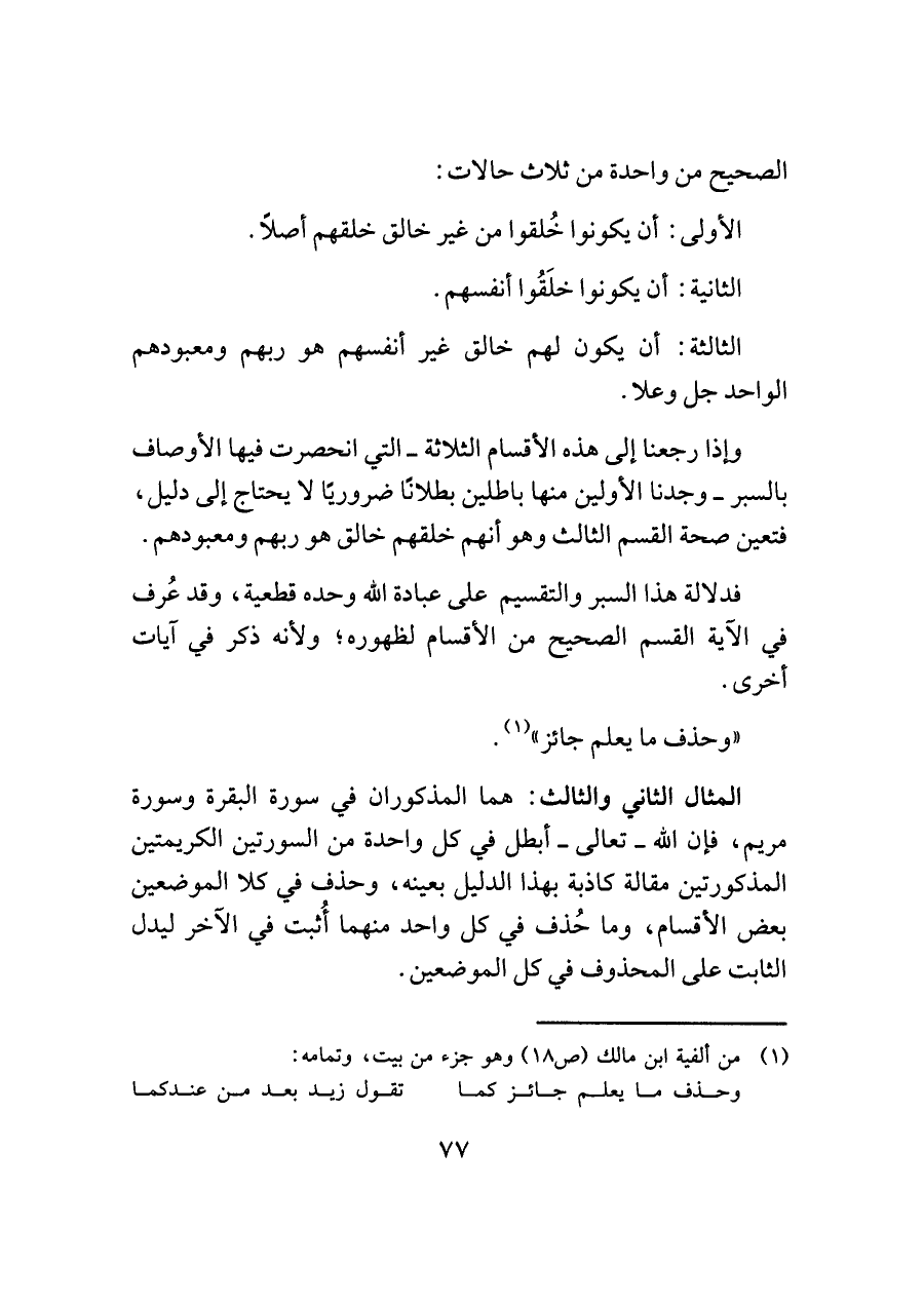 المثال الثاني والثالث: هما المذكوران في سورة البقرة وسورة مريم، فإن الله -تعالى- أبطل في كل واحدة من السورتين الكريمتين المذكورتين مقالة كاذبة بهذا الدليل بعينه، وحذف في كلا الموضعين بعض الأقسام، وما حُذف في كل واحد منهما أُثبت في الآخر ليدل الثابت على المحذوف في كل الموضعين.