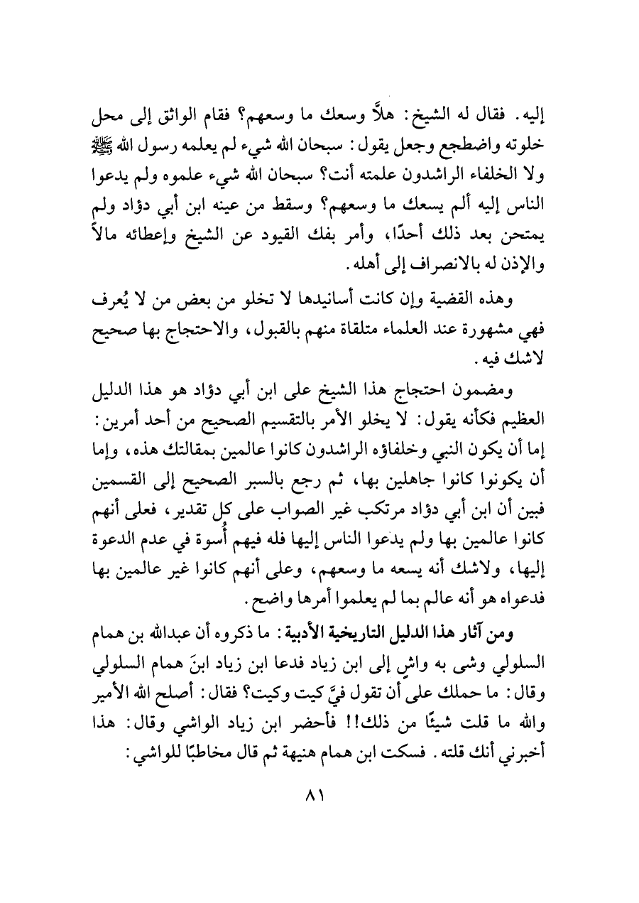 ومضمون احتجاج هذا الشيخ على ابن أبي دؤاد هو هذا الدليل العظيم فكأنه يقول: لا يخلو الأمر بالتقسيم الصحيح من أحد أمرين: إما أن يكون النبي وخلفاؤه الراشدون كانوا عالمين بمقالتك هذه، وإما أن يكونوا كانوا جاهلين بها، ثم رجع بالسبر الصحيح إلى القسمين فبين أن ابن أبي دؤاد مرتكب غير الصواب على كل تقدير، فعلى أنهم كانوا عالمين بها ولم يدعوا الناس إليها فله فيهم أُسوة في عدم الدعوة إليها، ولا شك أنه يسعه ما وسعهم، وعلى أنهم كانوا غير عالمين بها فدعواه هو أنه عالم بما لم يعلموا أمرها واضح.