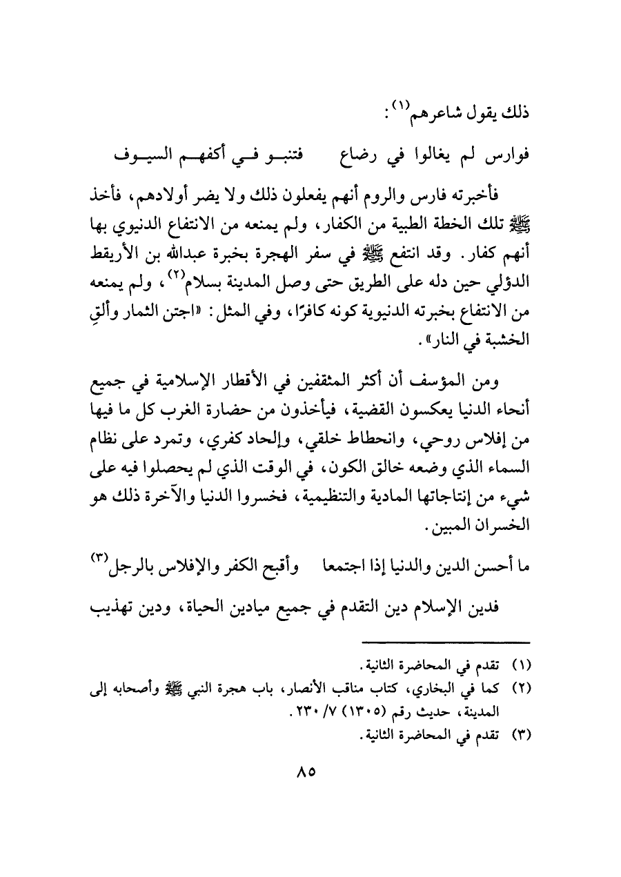 ومن المؤسف أن أكثر المثقفين في الأقطار الإسلامية في جميع أنحاء الدنيا يعكسون القضية، فيأخذون من حضارة الغرب كل ما فيها من إفلاس روحي، وانحطاط خلقي، وإلحاد كفري، وتمرد على نظام السماء الذي وضعه خالق الكون، في الوقت الذي لم يحصلوا فيه على شيء من إنتاجاتها المادية والتنظيمية، فخسروا الدنيا والآخرة ذلك هو الخسران المبين.
