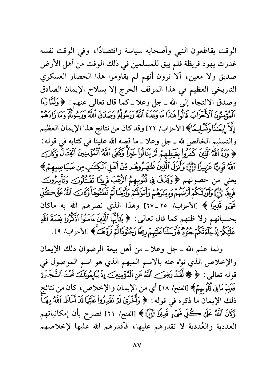 الوقت يقاطعون النبي وأصحابه سياسة واقتصادًا، وفي الوقت نفسه غدرت يهود قريظة فلم يبق للمسلمين في ذلك الوقت من أهل الأرض صديق ولا معين، ألا ترون أنهم لم يقاوموا هذا الحصار العسكري التاريخي العظيم في هذا الموقف الحرج إلا بسلاح الإيمان الصادق وصدق الالتجاء إلى الله - جل وعلا -كما قال تعالى عنهم: {وَلَمَّا رَأَى الْمُؤْمِنُونَ الْأَحْزَابَ قَالُوا هَذَا مَا وَعَدَنَا اللَّهُ وَرَسُولُهُ وَصَدَقَ اللَّهُ وَرَسُولُهُ وَمَا زَادَهُمْ إلا إِيمَانًا وَتَسْلِيمًا (٢٢)} [الأحزاب: ٢٢] وقد كان من نتائج هذا الإيمان العظيم والتسليم الخالص لله -جل وعلا- ما قصه الله علينا في كتابه في قوله: {وَرَدَّ اللَّهُ الَّذِينَ كَفَرُوا بِغَيظِهِمْ لَمْ يَنَالُوا خَيرًا وَكَفَى اللَّهُ الْمُؤْمِنِينَ الْقِتَال وَكَانَ اللَّهُ قَويًّا عَزِيزًا (٢٥) وَأَنْزَلَ الَّذِينَ ظَاهَرُوهُمْ مِنْ أَهْلِ الْكِتَابِ مِنْ صَيَاصِيهِمْ} يعني من حصونهم {وَقَذَفَ فِي قُلُوبِهِمُ الرُّعْبَ فَرِيقًا تَقْتُلُونَ وَتَأْسِرُونَ فَرِيقًا (٢٦) وَأَوْرَثَكُمْ أَرْضَهُمْ وَدِيَارَهُمْ وَأَمْوَالهُمْ وَأَرْضًا لَمْ تَطَئُوهَا وَكَانَ اللَّهُ عَلَى كُلِّ شَيءٍ قَدِيرًا} [الأحزاب: ٢٦، ٢٧] وهذا الذي نصرهم الله به ما كان بحسبانهم ولا ظنهم كما قال تعالى: {يَا أَيُّهَا الَّذِينَ آمَنُوا اذْكُرُوا نِعْمَةَ اللَّهِ عَلَيكُمْ إِذْ جَاءَتْكُمْ جُنُودٌ فَأَرْسَلْنَا عَلَيهِمْ رِيحًا وَجُنُودًا لَمْ تَرَوْهَا} [الأحزاب: ٩].